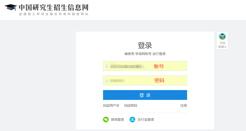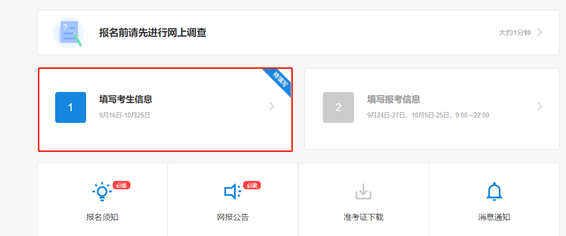 考生打开研招网(//yz.chsi.com.cn/)主页 后,用已注册的学信网账号登录网报系统,网报系统将报名分为填写考生信息和填写报考信息两部分。