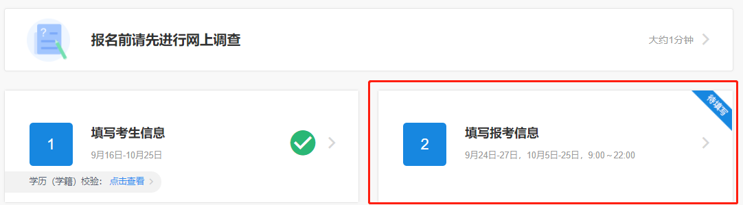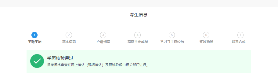 一般情况下,在“填写考生信息”阶段,考生填报的学历(学籍)信息可以快速校验,如遇网络拥堵等特殊情况,将出现“进行中”的状态,考生可以继续填写考生信息中的其他部分,不影响接下来的操作。考生也可在报名前或报名期间自行登录“中国高等教育学生信息网”(网址://www.chsi.com.cn)或关注学信网公众号查询本人学历(学籍)信息。未通过网上学历(学籍)校验的考生,国内学历应及时到中国高等教育学生信息网进行学历(学籍)认证,国外学历应及时到教育部留学服务中心进行认证。在现场确认时按照报考点要求将认证报告交报考点核验。