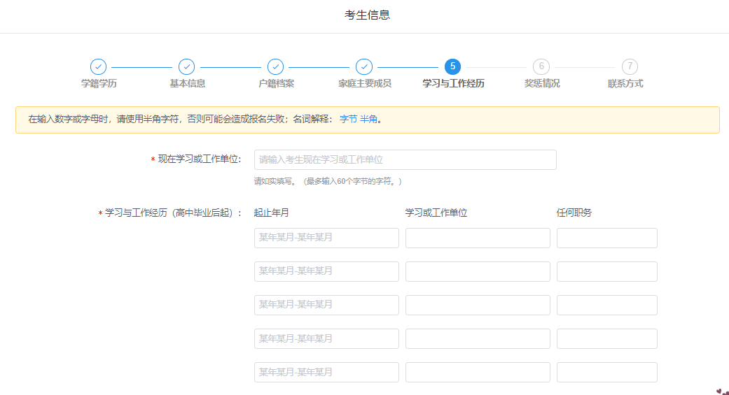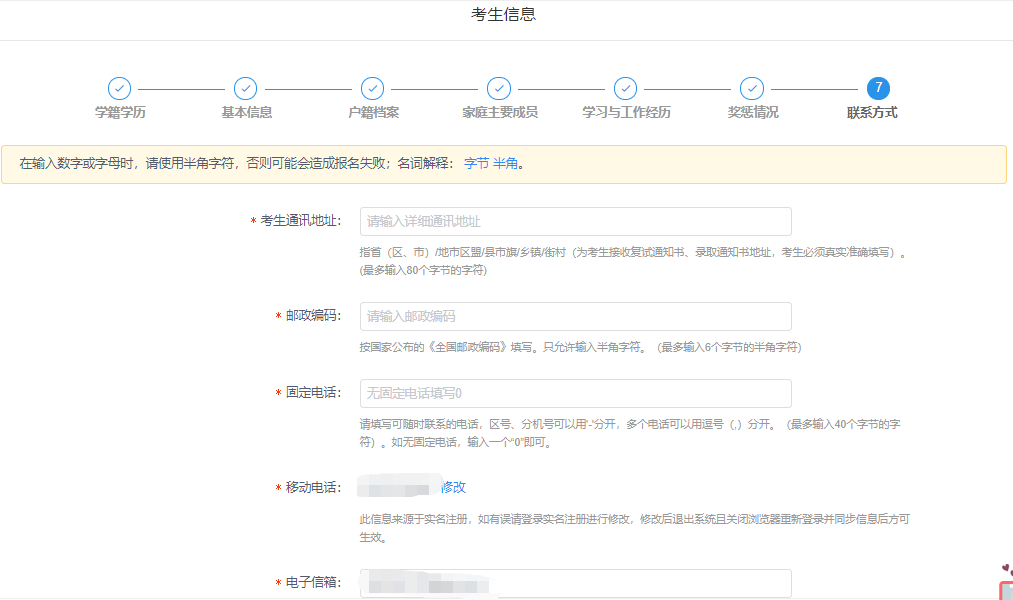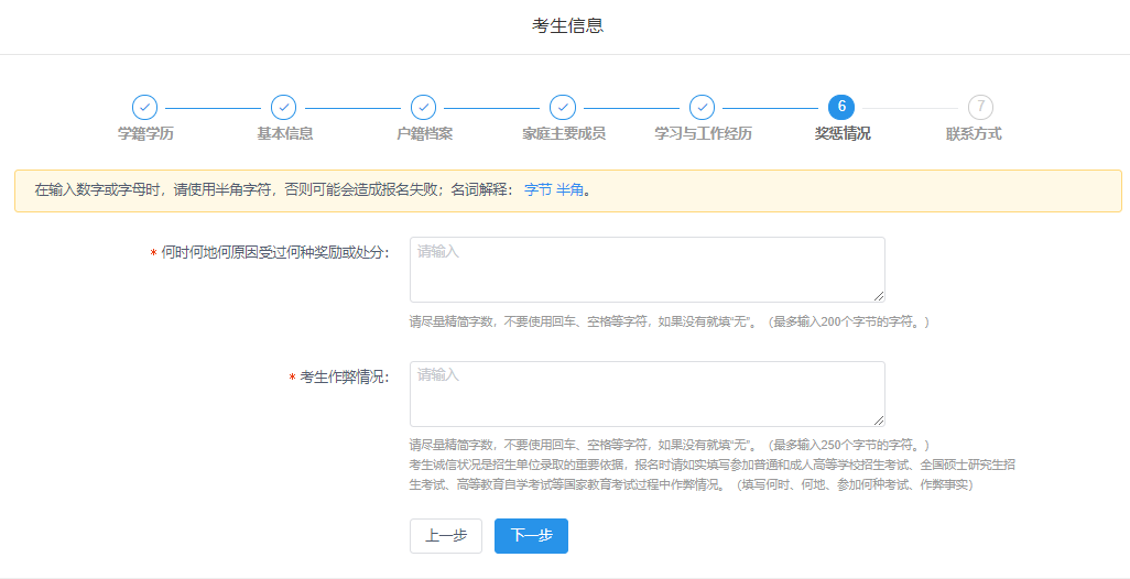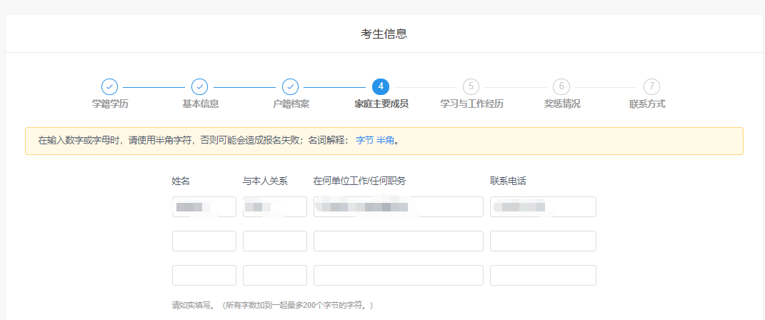 填写完基本信息后开始填写户籍档案、家庭主要成员、学习与工作经历、奖惩情况和联系方式等信息。