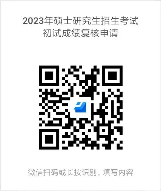 2.申请方式为微信扫描下方二维码,准确、完整填写考生编号(15位数字)、考生姓名、身份证号、复核科目代码(3位数字)、复核科目名称、已查知成绩、申请复核理由、联系电话等各项内容后提交。根据要求,考生需提交身份证正反两面照片,照片要剪裁规整,长宽调整为400像素x260像素或8.5厘米x5.5厘米,单张图片大小不超过350K。信息填写错误、不完整或者未提供身份证图片的视为无效申请,不予复核。