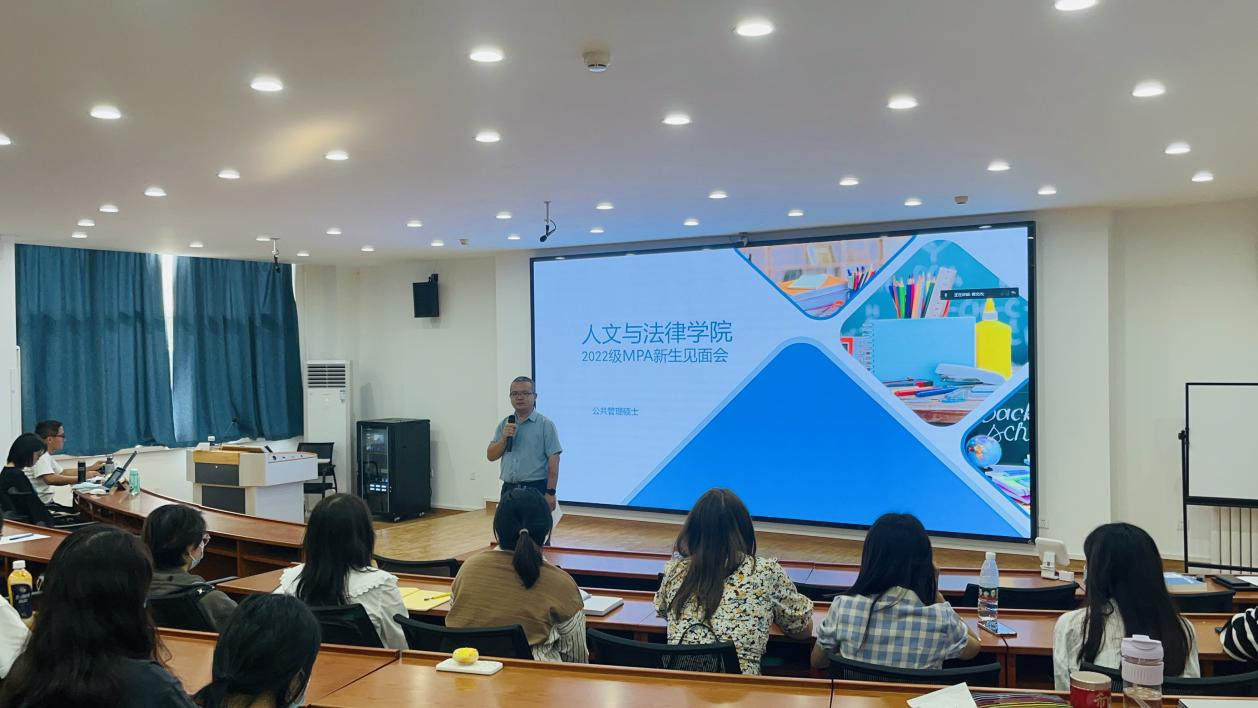 会议首先由闫文博副院长致辞。闫文博副院长简单介绍了学院发展历程,并对文法学院的未来进行了展望,今后的文法学院会不断改善办学条件,不断提升教学质量,创造更好的学术氛围。同时,闫文博副院长结合自己的求学经历,与新生分享感悟:珍惜时间,系统阅读,深入思考,并对新生提出了三点期望,一要身心健康,二要有容人之心,妥善处理人际关系,三要承继MPA优良传统,并勇于创新。