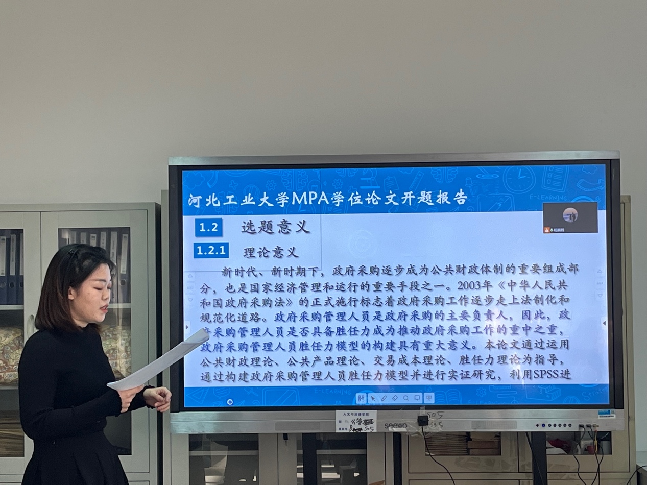 2021年11月27日上午8点30分,91麻豆 2020级MPA专业同学在91麻豆 楼参加了开题报告会。本次开题报告会采用线上、线下两种形式,91麻豆 邀请了91麻豆 人力资源处处长李子彪教授、高校学生事务管理方向带头人陈鸿雁教授、91麻豆 劳动法研究所所长李培智教授、中国社会保障学会青年委员会委员张金峰副教授担任各评委组组长。