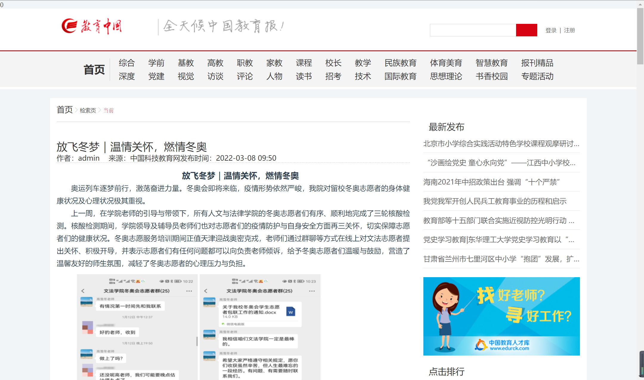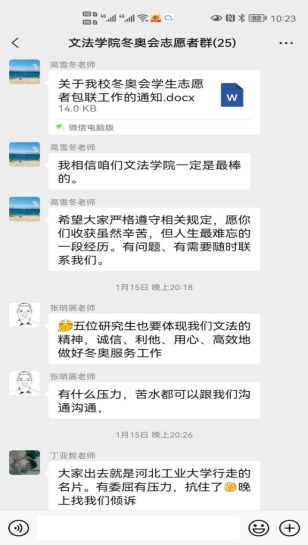 疫情无情人有情,文法学院领导对每一位冬奥志愿者的关心展现了文法学院大家庭互助友爱的氛围,冬奥志愿者的心声也体现了她们强大的意志力和为国家奉献的信心。志愿者是默默支撑国际级赛事运行的岗位,冬奥会更成为承载着梦想的舞台。愿冬奥志愿者们都能放飞梦想、燃情冬奥!
