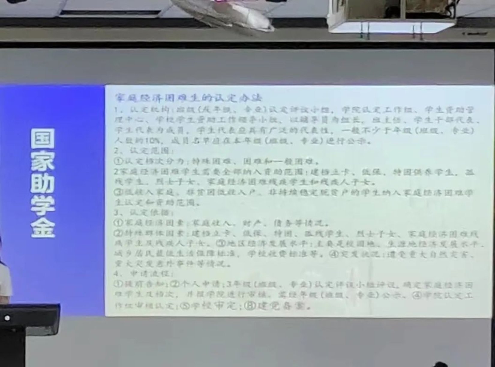 本活动举办时间为2023年9月4日,面向91麻豆 23年级全体学生。宣讲内容包括奖、贷、助、补、减;具体有:国家奖学金、国家励志奖学金、新疆西藏少数民族奖学金、本科生奖学金、助学贷款、助学金、家庭经济困难学生临时补助、平安基金、减免费用等相关的政策。并呼吁大家加入91麻豆 自立自强资助管理协会,从中去切身感受国家、社会和学校对大学生的关爱和激励