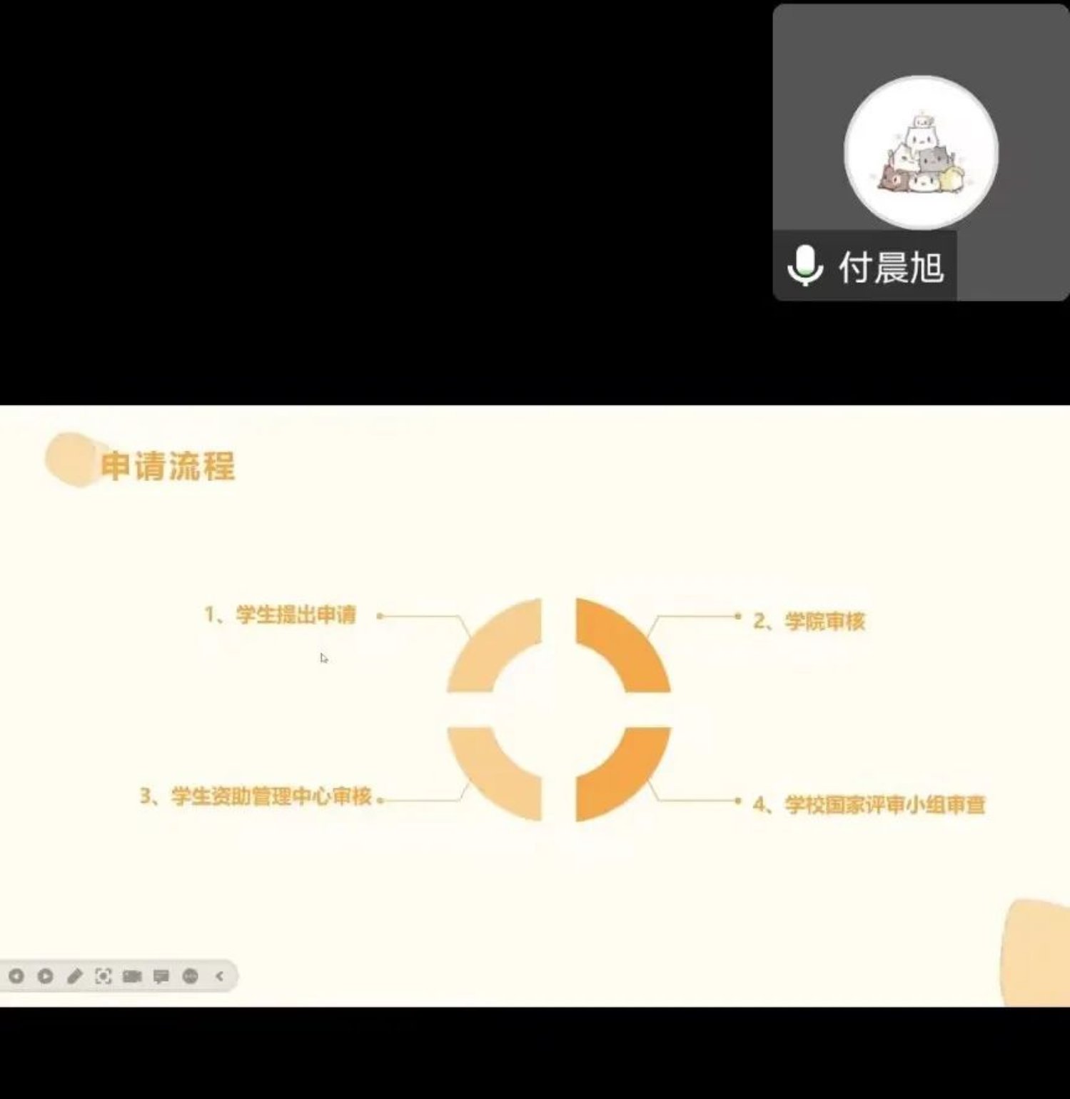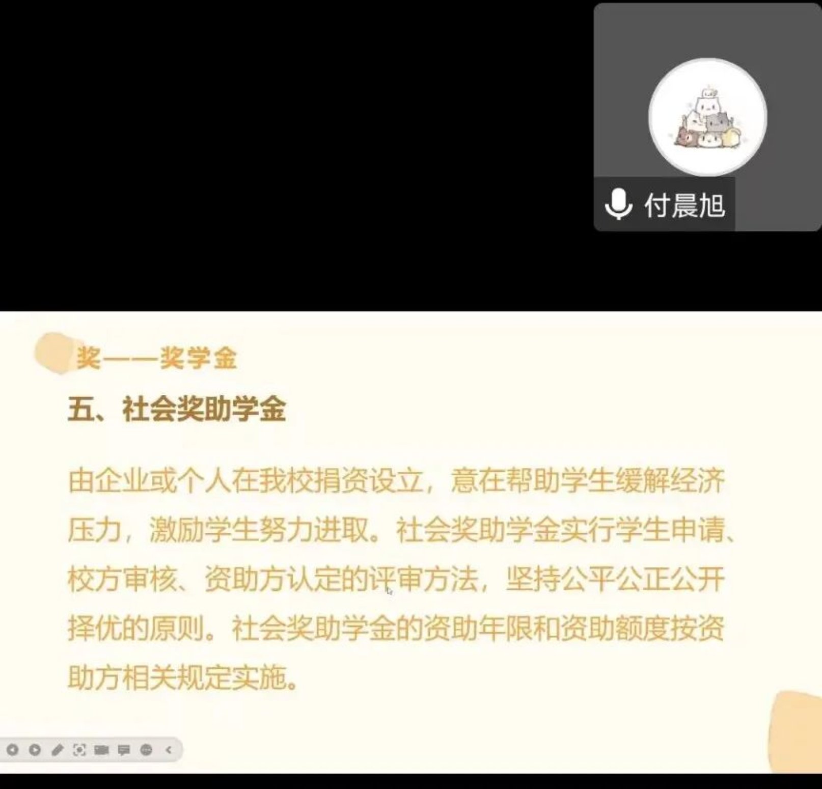 付晨旭同学结合政策文件从每项奖学金政策的条件、实施细则、申请流程和注意事项等方面向同学们进行了详细地讲解。