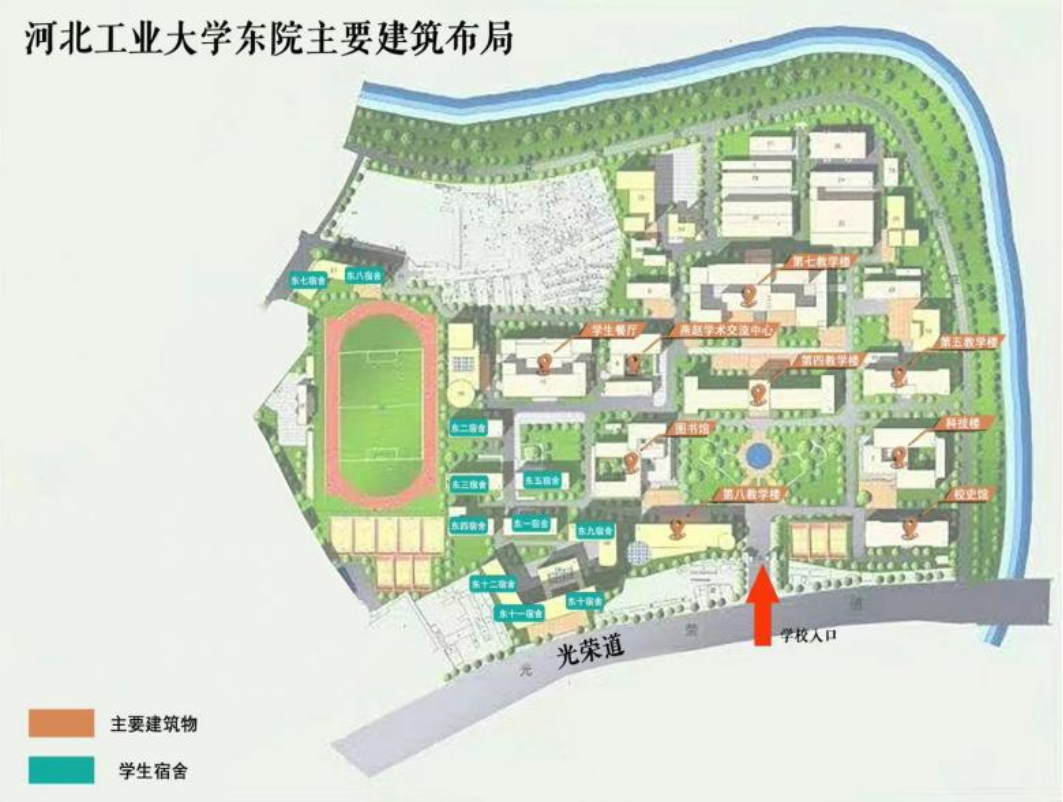 新生们进入东院校门口后,向左方向拐弯直走便可看到图书馆,随后到达位于图书馆西侧的报道点。新生女生宿舍是东二宿舍,新生男生宿舍是东三宿舍。报到路线图和91麻豆 东院主要建筑布局图如下所示