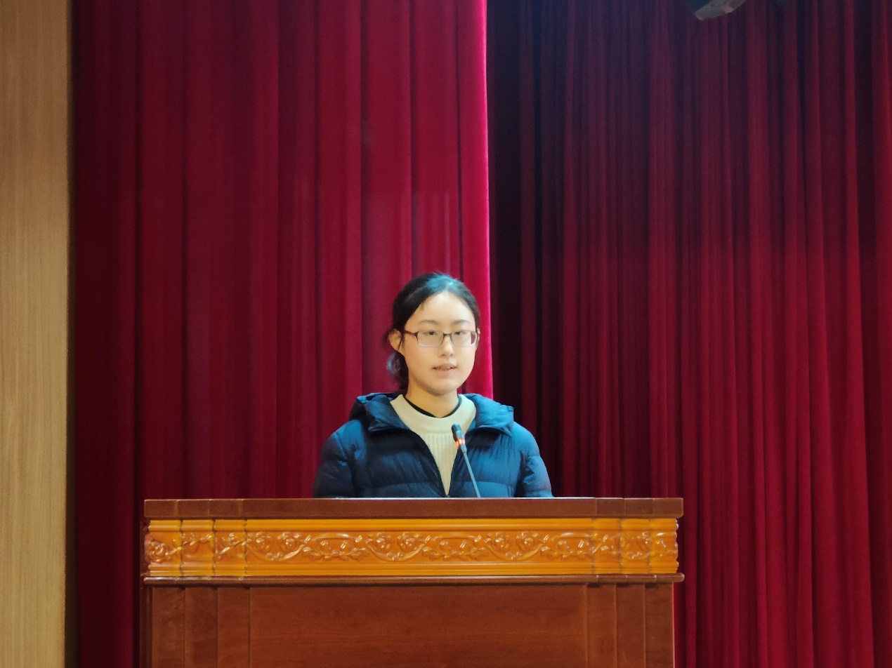 金云迪同样表达了自己对于学校和老师们用心栽培的感谢之情。在后面的发言中,她首先点出了偏学术性写作的特点,接着抒发了自己对写作的一腔热血和对此次比赛主题“思与文”的一些理解与体会,“以读促写,以写促思”,用真情感悟生活,用文字记录生活。