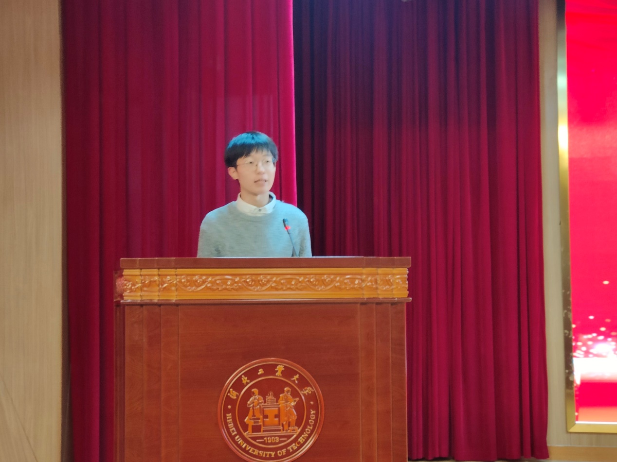 获奖学生代表宇文明与金云迪也分别上台发言,分享他们参加此次比赛的心情与感想。宇文明首先对学校和老师们表达诚挚感谢,并从此次征文活动中遇到的困难入手,借“一元钱诉讼”的事例铺陈出法学研究与论文写作道路上的挫折与收获。最后,宇文明鼓励同学们共同努力,勤奋学习,为学校和社会的繁荣发展作出应有的贡献。