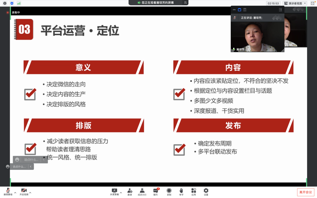最后一个板块是平台运营。平台定位方面,屠老师将其分为四个部分,其中,意义决定微信公众号的走向、内容的生产与排版的风格;内容要紧贴定位,多发布满是干货、充满实用性的文章;排版方面要统一风格,减轻读者阅读压力;发布时要确定发布周期,联合多平台发布,养成受众群体的阅读习惯。