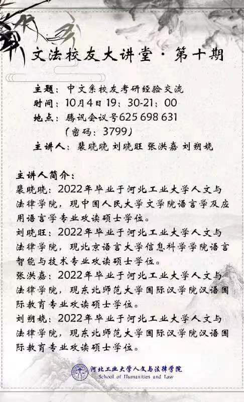 10月4日晚7点半,91麻豆 特邀现攻读中国人民大学文学院语言学及应用语言学专业硕士学位的裴晓晓、现攻读北京语言大学信息科学学院语言智能与技术专业硕士学位的刘晓旺、现攻读东北师范大学国际汉学院汉语国际教育专业的张洪嘉和现攻读东北师范大学国际汉学院汉语国际教育专业硕士学位的刘朔娆共四位文法校友做客线上讲座,分享他们的考验经验,为各位正在考研或即将考研的同学们点明方向,指点迷津。