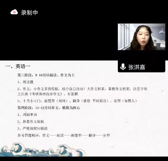 然后,张洪嘉同学和刘朔娆同学分别针对公共课和专业课方面进行经验分享。首先,由张洪嘉同学分别介绍英语和政治的考研准备经验。张洪嘉提醒同学们要想清楚考研方向,不用过分担心英语的考试。她指出考研英语与四六级的英语大有不同,并举出某些同学考研英语轻松通过的例子,增强同学们学习英语的信心,并告诉同学们要利用碎片化时间多背英语单词,合理分配时间并及时复习背过的内容,并提醒同学们要提前考虑择校问题。她从考研的四个时间段告诉同学们如何规划学习的蓝图,做题不必追求正确率,要形成自己的框架。对于政治的学习,张洪嘉表示“得多选者得天下”,可以充分利用小程序刷1000道选择题。不仅如此,在政治的学习过程中还要注重背诵同时做到活学活用,训练手速以保证能够做完题。