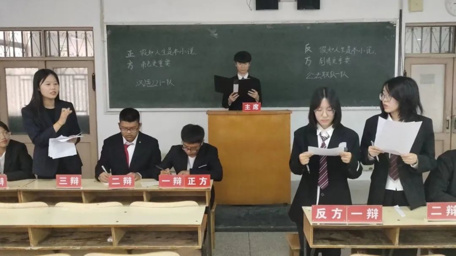 “人生是一本特殊的书,我们既是作者,又是读者。”正、反两方把人生放在小说框架之下,针对“假如人生是一本小说,角色重要还是剧本重要”这一辩题展开辩论。正方认为剧情是由角色创造的,“没有自我,谈何人生”,角色的选择造就精彩人生;反方认为剧情是小说的内核,是它赋予了角色精彩的人生,走好人生剧情是打破固有人设的方法。经过激烈的交锋,最终双方打成平手,反方二辩孙塬璐被评为“最佳辩手”。