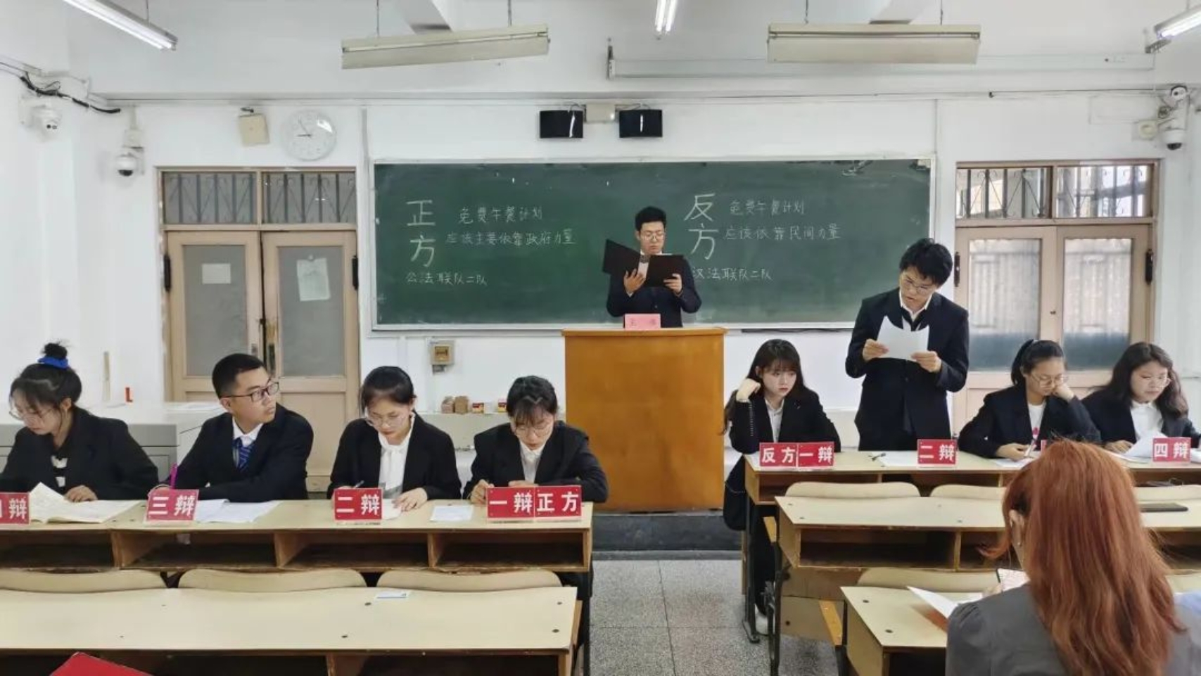 免费午餐计划倡议为贫困学童提供免费午餐,可从长远来看,对计划的保障主要该由何方承担,引起了大家的广泛关注。正方和反方围绕“免费午餐计划应该主要依靠政府力量还是民间力量”展开辩论。正方认为免费午餐计划应该主要依靠政府力量,因为政府拥有更多的资金和更安全的保障,并且已经有了许多成功的经验;反方则认为免费午餐计划应该主要依靠民间力量,民间力量更具灵活性,具有及时发现和跟进的优点。双方立场坚定、论据充分,经过激烈的辩论,最终正方获胜,正方一辩檀若楠获得“最佳辩手”称号。
