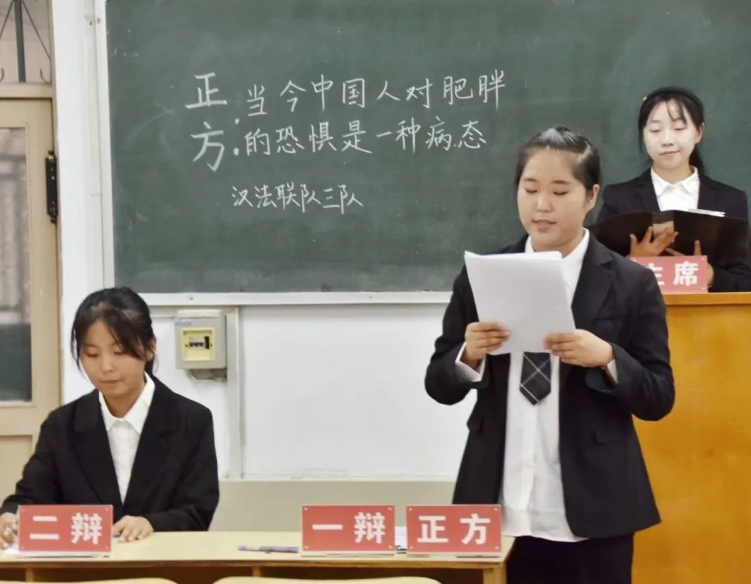 随着社会的发展,肥胖人群的规模不断扩大,由肥胖导致的疾病也频发,当今中国人对肥胖产生了恐惧。正方和反方就“当今中国人对肥胖的恐惧是不是一种病态”这一辩题展开辩论。正方认为对肥胖的恐惧产生的原因本就不合理,且人们对肥胖的恐惧会催生出身体、心理疾病,弊端甚多;反方从病理性、社会性展开论述,认为人们对肥胖的恐惧可以激励人们向好发展,且并没有对社会造成普遍伤害。最终正方取得胜利,反方三辩李沛霖凭借精彩表现荣获“最佳辩手”称号。