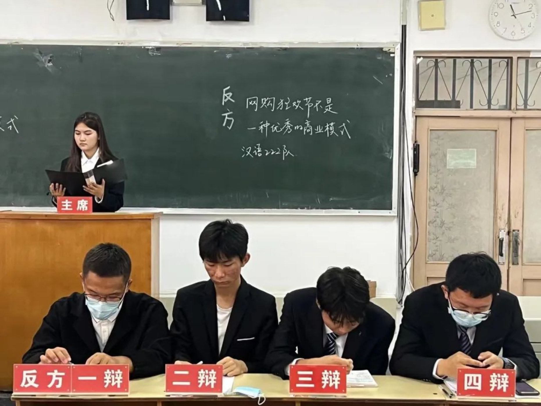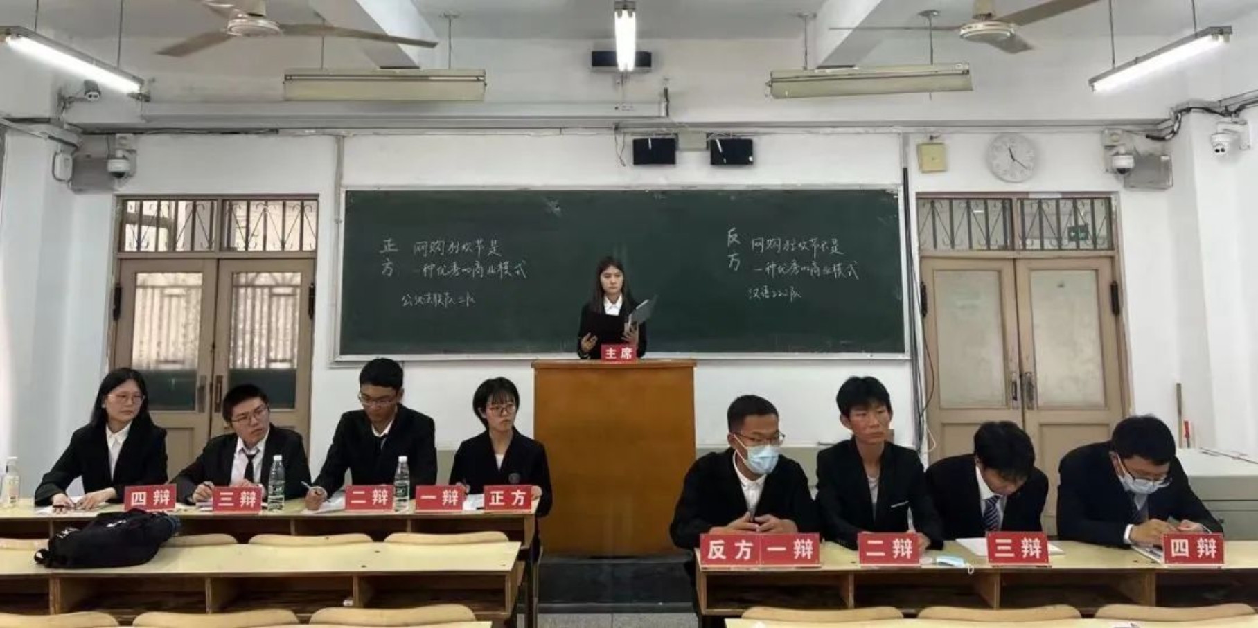 互联网技术的发展和网购的兴起促使“618”、“双十一”等网络购物狂欢节纷纷涌现。正方和反方围绕“网购狂欢节是不是一种优秀的商业模式”这一辩题展开辩论。正方认为网购狂欢节使消费者便利,让商家盈利,能够更好地促进社会经济发展;反方认为网络购物狂欢节无法避免市场的滞后性,而且具有隐私性差、风险高的缺点,难以做到经济效益和社会效益的统一。经过一场激烈的雄辩,最终正方更胜一筹,正方四辩张炯怡成为本场“最佳辩手”。