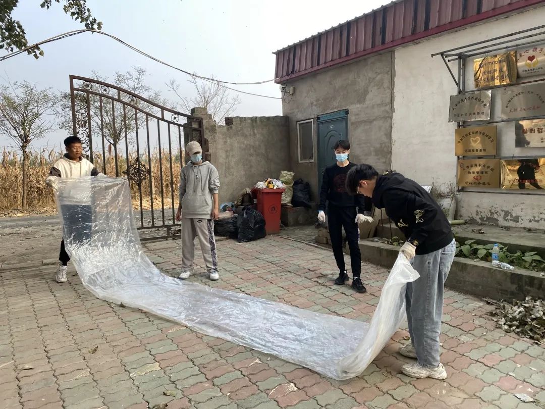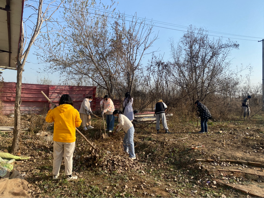 “秋风起兮白云飞,草木黄落兮雁南归。”秋天带走了最后一丝绿意,黄叶悄然落下。同学们带着似火的热情,伴随着飞舞的落叶,将它们会聚成一堆的小山。文法学子们整理院内杂物,为孩子们提供一片整洁的活动区域。
