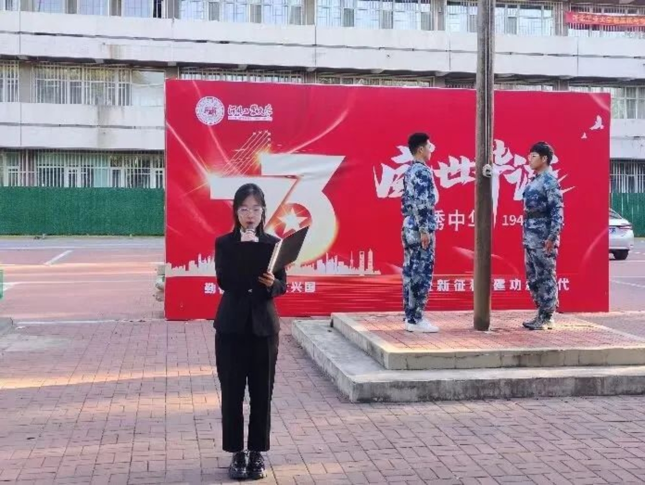 迎着朝阳,伴随着雄壮的《义勇军进行曲》,五星红旗冉冉升起,文法学院全体师生向国旗行注目礼,目光中流露出对祖国无限的热爱和深情的祝福。