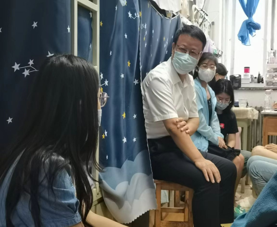 在男生宿舍中,一位来自内蒙古、喜爱运动的男生兴奋地与老师们交谈,讲述自己今年开学后的感受:北院环境改善了很多,操场的灯亮起来了,新篮球场也盖起来了,晚上运动的方式又多了很多。老师经常来看望我们,同学们也很和善,期待疫情早日结束!听到这些话,老师们叮嘱同学们要快速适应大三的学习节奏,同时也要劳逸结合,保证身体健康。