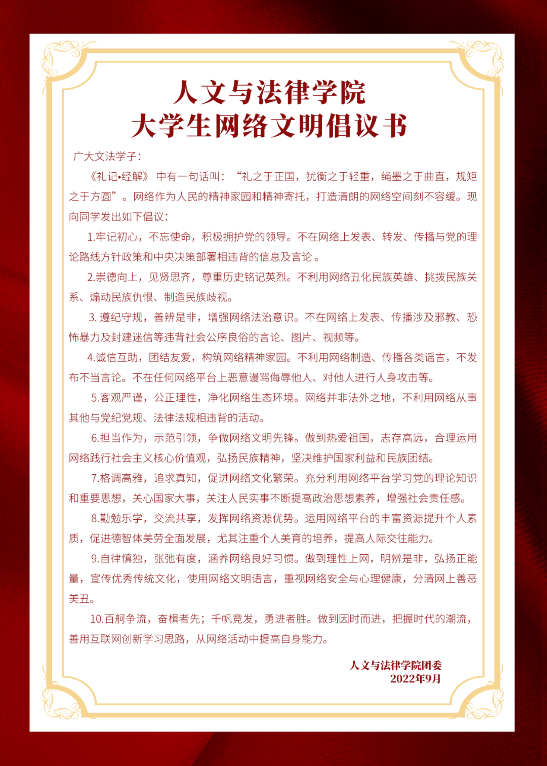 文法学院学工办主任兼团委书记高雪冬发出“清朗网络,文化育人”的网络文明倡议,号召大家要遵守网络法律法规,弘扬遵纪守法正能量正能,自觉维护好网络安全。