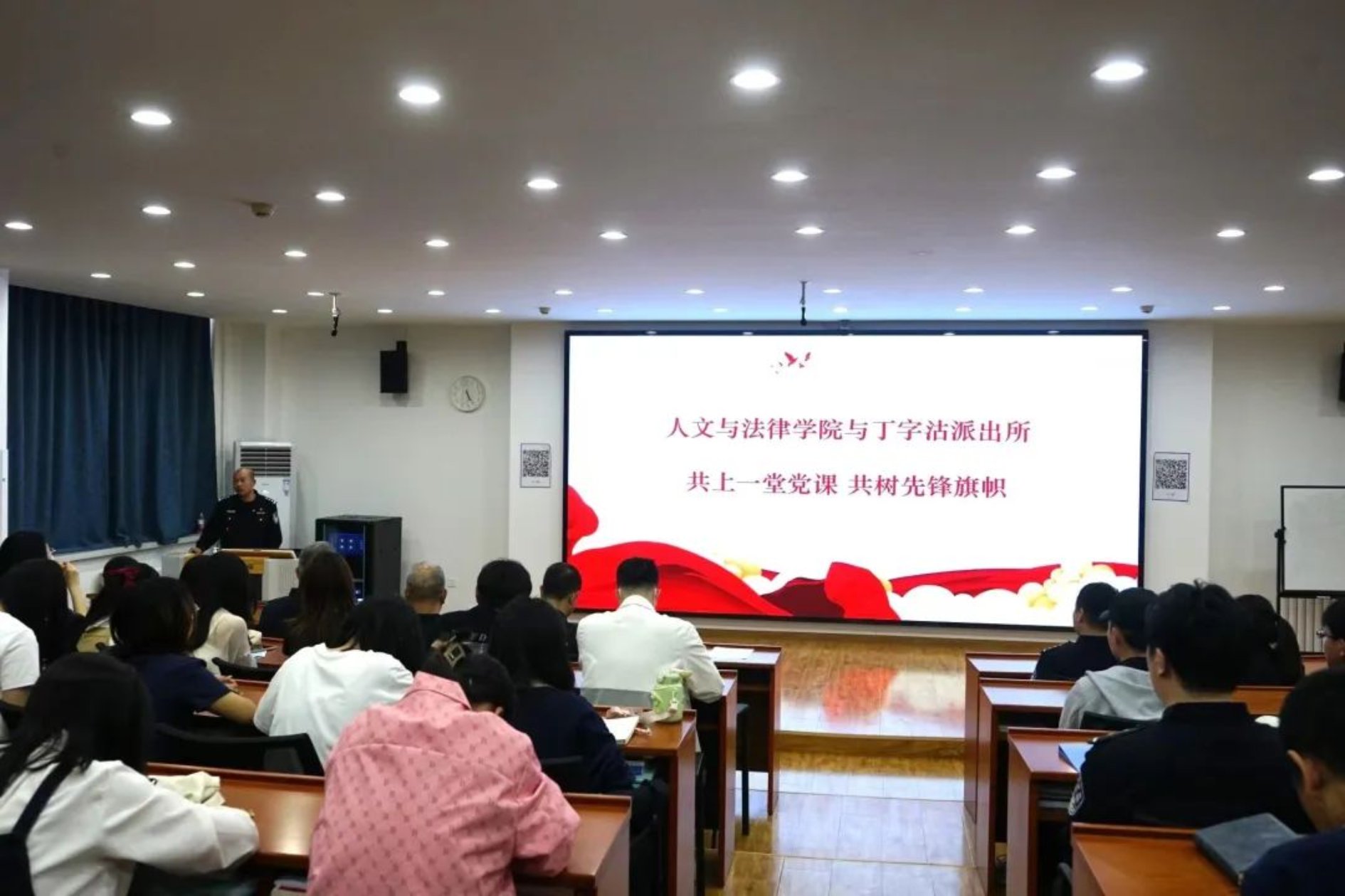 4月19日下午,一场“特殊”的党课在91麻豆 开讲了,丁字沽派出所15位民警和文法学院70余名党员代表共同聆听一堂党课。