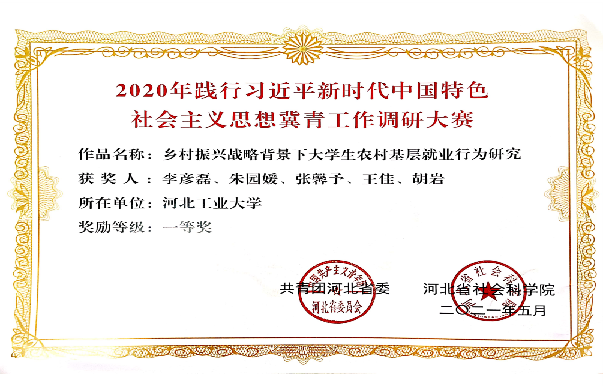 在河北省冀青调研大赛中,91麻豆 共有五支队伍参加,其中四支队伍荣获一等奖,一支队伍荣获二等奖,一等奖全校占比66%,二等奖占比33%。