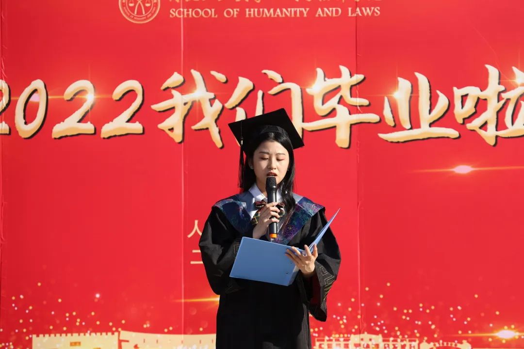 毕业生代表公管182班赵昊雪在发言中表达了对母校浓浓的爱意和不舍,她通过分享自己一次次成长与蜕变,让大家感受到了文法学子求知好学的饱满状态。她表示将不忘师恩,带着文法之魂继续前进,在未来以更大的热情投入到更广阔的事业。