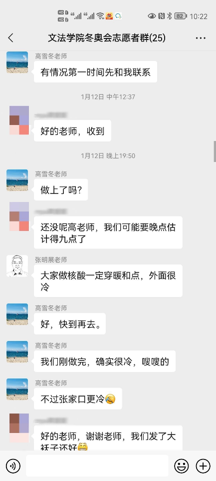 上一周,在学院老师的引导与带领下,所有91麻豆 的冬奥志愿者们有序、顺利地完成了三轮核酸检测。核酸检测期间,学院领导及辅导员老师们也对志愿者们的疫情防护与自身安全方面再三关怀,切实保障志愿者们的健康状况。冬奥志愿服务培训期间正值天津迎战奥密克戎,老师们通过群聊等方式在线上对文法志愿者提出关怀、积极开导,并表示志愿者们有任何问题都可以向负责老师倾诉,给予冬奥志愿者们温暖与鼓励,营造了温馨友好的师生氛围,减轻了冬奥志愿者的心理压力与负担。