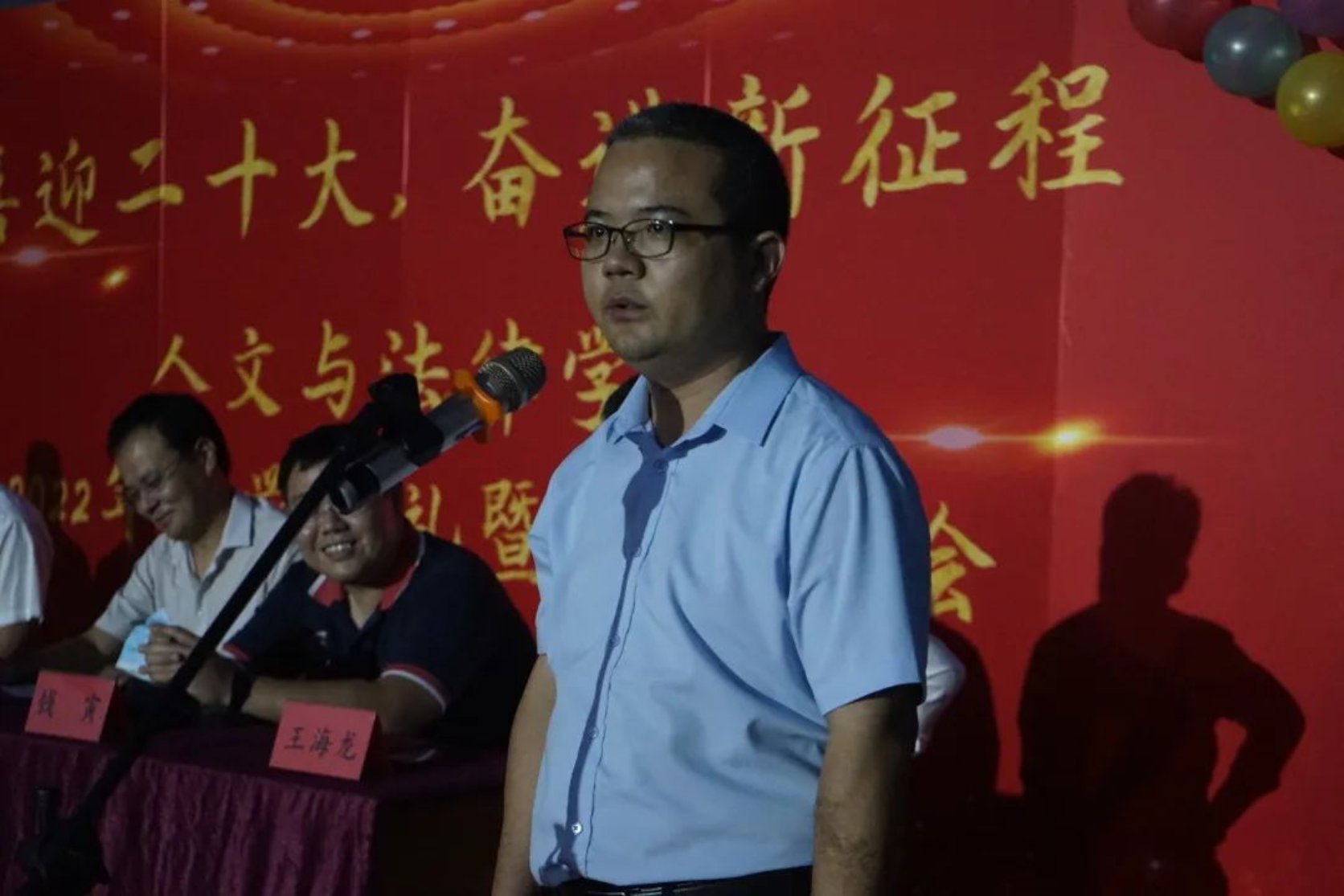今夜,笑声朗朗,欢聚一堂;明朝,促膝并肩,遨游课堂。秋韵渐浓,相约九月,何其有幸,我们相遇在文法学院。“天行健,君子以自强不息”,在大学这个新的起跑线上,同学们应谨记领导和老师的教诲。“勤慎公忠为理想,学海无涯苦作舟”,我们应珍惜时光,敢于担当,不负韶华。让我们以先人为向导,与伙伴比肩同行,一起创造享受无比绚烂、无限光明的大学生活,铸造属于文法学子的华章。