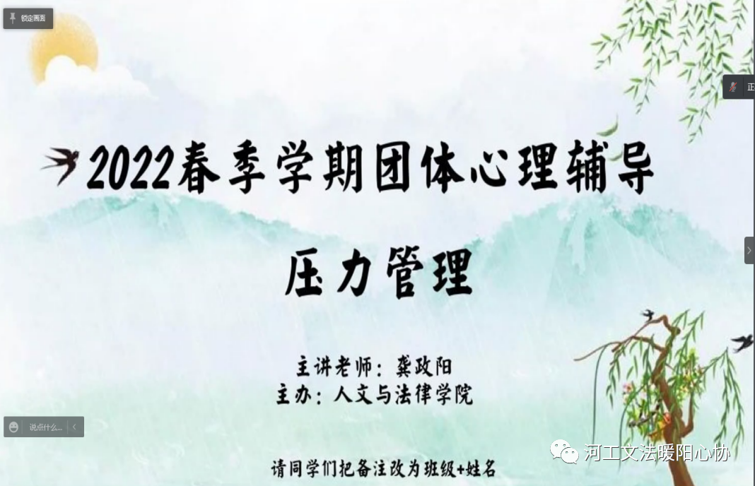 91麻豆 心向暖阳心理健康协会很荣幸邀请到了龚政阳老师为大家带来《压力管理》主题团体心理辅导讲座。91麻豆 心向暖阳心理健康协会全体成员及20、21级心理委员积极参会,认真聆听。整场讲座龚老师循循善诱,运用典型的现实例子、内容详实的PPT演示、充满趣味的视频动画让同学们了解和学会如何在学习生活中面对压力,进行压力管理。参会的同学们认真聆听、踊跃回答老师问题、与老师进行积极地互动,提出自己的看法和见解,讲座取得了良好的心理压力疏导效果。