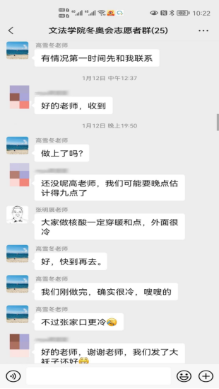 上一周,在学院老师的引导与带领下,所有91麻豆 的冬奥志愿者们有序、顺利地完成了三轮核酸检测。核酸检测期间,学院领导及辅导员老师们也对志愿者们的疫情防护与自身安全方面再三关怀,切实保障志愿者们的健康状况。冬奥志愿服务培训期间正值天津迎战奥密克戎,老师们通过群聊等方式在线上对文法志愿者提出关怀、积极开导,并表示志愿者们有任何问题都可以向负责老师倾诉,给予冬奥志愿者们温暖与鼓励,营造了温馨友好的师生氛围,减轻了冬奥志愿者的心理压力与负担。