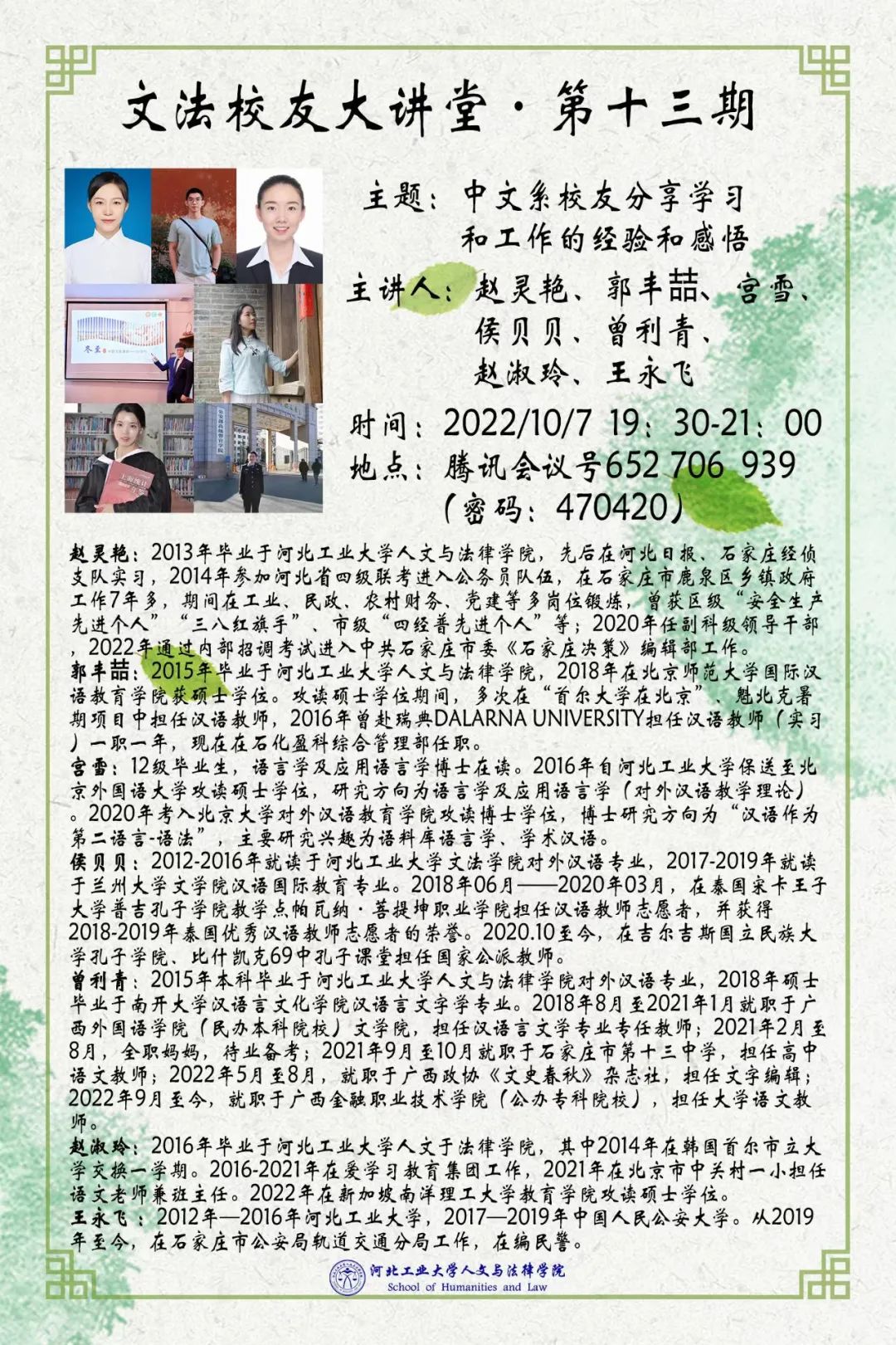 10月7日晚7点半,91麻豆 特邀中共石家庄市委《石家庄决策》编辑部部员赵灵艳、石化盈科综合管理部部员郭丰喆、大学语文教师曾利青、孔子学院国家公派教师侯贝贝、北京大学语言学在读博士宫雪、新加坡南洋理工大学教育学在读硕士赵淑玲、石家庄轨道交通分局民警王永飞等校友做客线上讲座,为同学们分享他们在学习和工作中的经验与感悟,提供更多可行性建议。