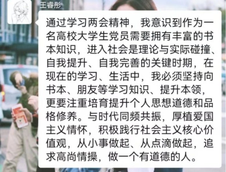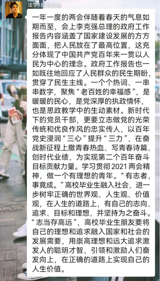 十三届全国人大五次会议与全国政协十三届五次会议分别于2022年3月5日-3月11日与2022年3月4日-3月10日在北京召开。法学专业学生第二党支部的32位成员紧跟思想潮流,积极进行理论学习,并在学习两会思想后纷纷在群里发表了自己的看法。