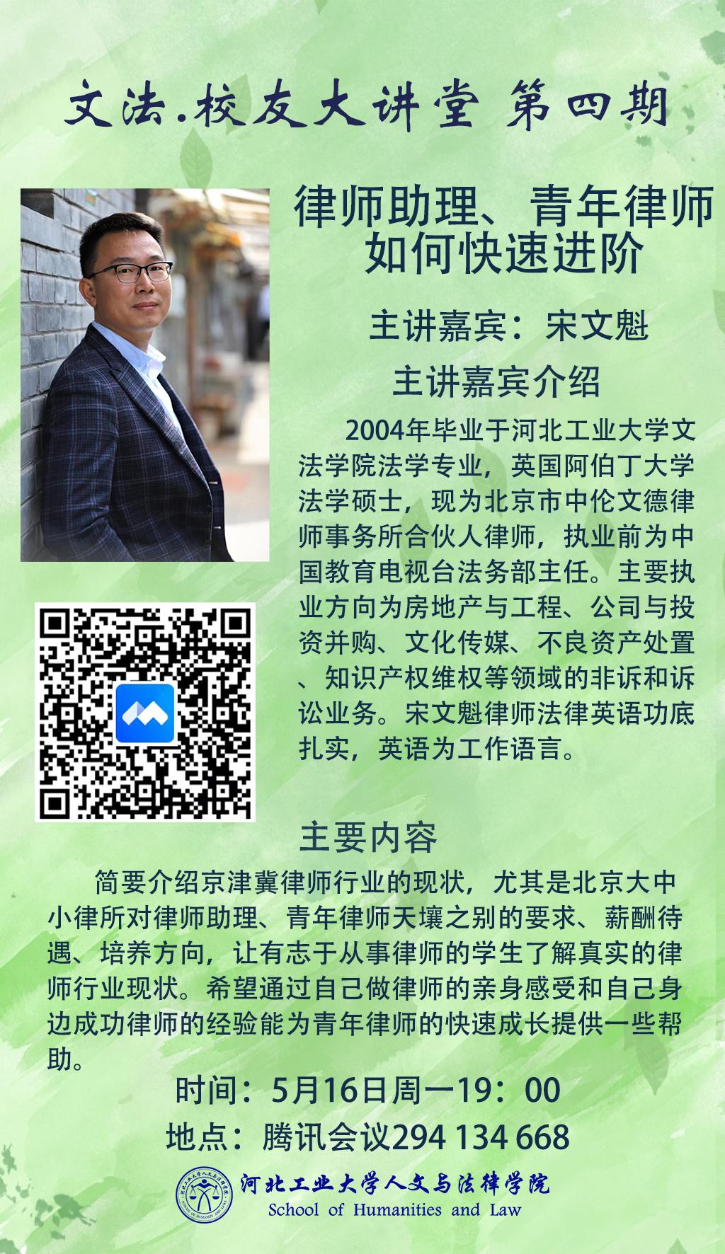 5月16日晚,北京市中伦文德律师事务所合伙人律师宋文魁做客文法校友大讲堂,为在校学生做了题为“律师助理、青年律师如何快速进阶”的线上讲座,100多名师生参加了本次讲座。