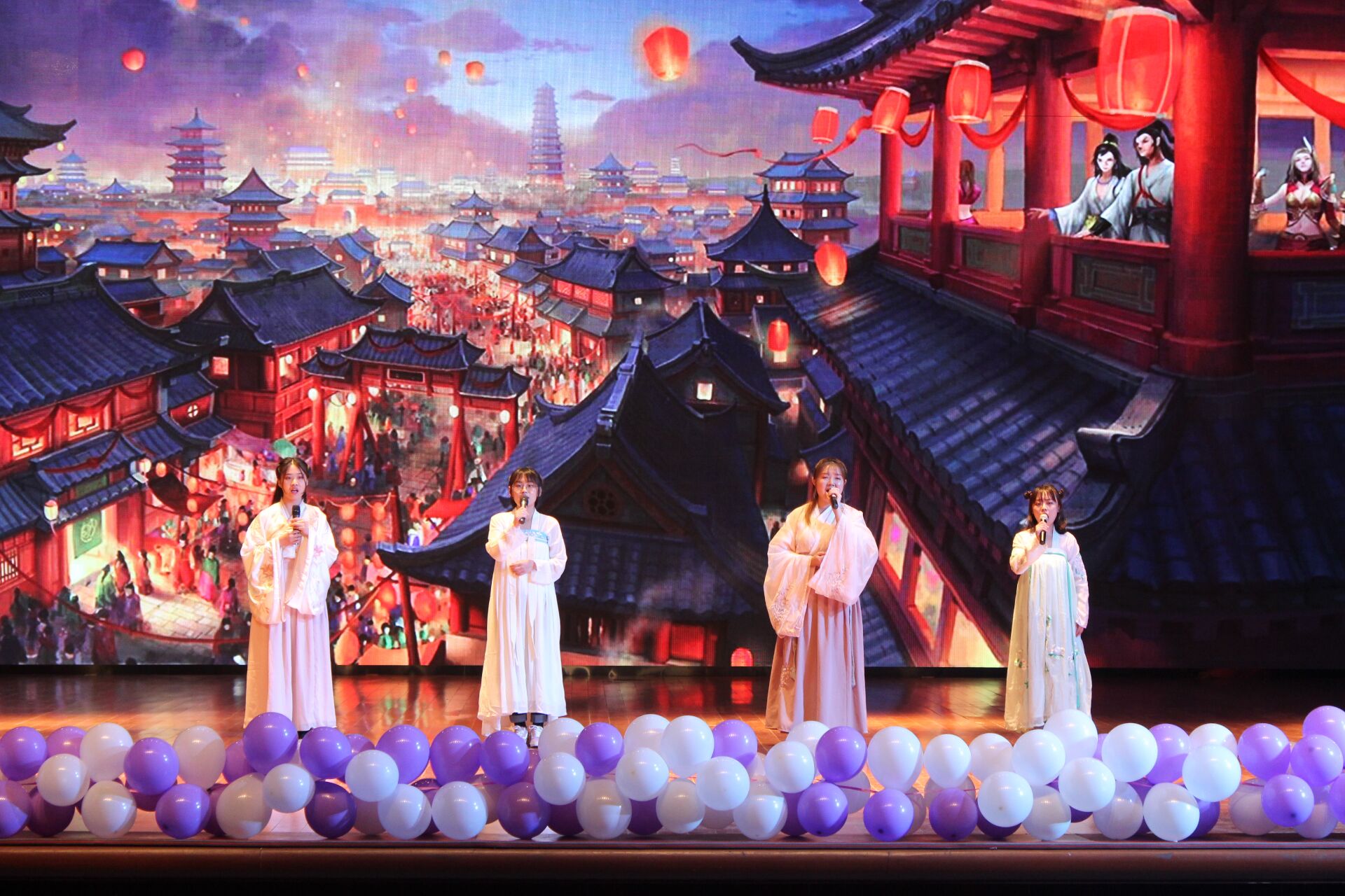 青柳碧遥遥,经典永流传。古人有曲水流觞,今人有诗歌相会。“春暖三月,诗满校园”上巳节经典诵读晚会,古今相交,共享诗情。党委宣传部部长陈鸿雁老师在致辞中提到:“学校党委积极贯彻落实习近平总书记关于文化自信的理念,大力推进传统文化进校园活动,让学生们真正成为传统文化的继承者和传播者。并殷切希望上巳节诗歌大会能继续发挥学院优势,营造浓厚的校园文化氛围。”晚会既现汉唐风采,又富时代特色。有舞步翩翩,汉服纸伞,珠钗步摇;有歌声婉转,空灵悠扬,莺愧群散;有四海知己,才子佳人聚,诵诗情画意;有附中学生的童声朗朗,一首《春江花月夜》,带全场看到千年前的海上明月、江流宛转。古时杯流如洛水,今日飞花似春风。晚会的飞花令游戏环节以“月”、“秋”等字为题,调动起了全场的气氛,让人领略到了诗歌经典的魅力和中华文化的博大精深。
