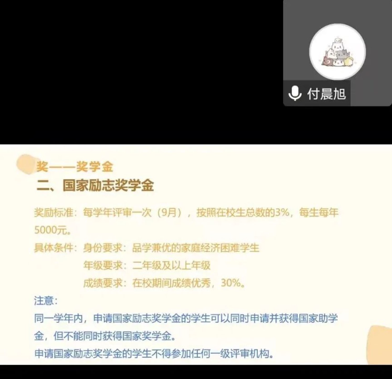 付晨旭同学结合政策文件从每项奖学金政策的条件、实施细则、申请流程和注意事项等方面向同学们进行了详细地讲解。