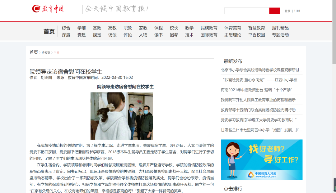 教育中国发表《院领导走访宿舍慰问在校学生》