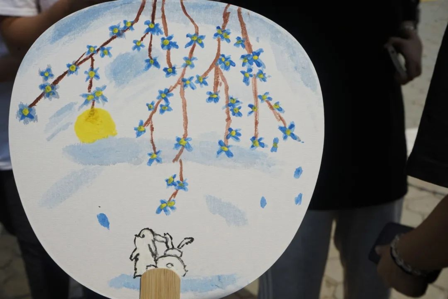 在活动过程中,同学们自己构思设计,用工具在扇面上进行绘画。学生们既秉持传统,又张扬个性,在短短的时间内,创作出一把把风格迥异的团扇,有的扇面展现着古典的清新淡雅,有的扇面展现着现代的绚丽多彩……一把把象征团圆与思念的美丽团扇就这样在学生手中诞生了,艺术之花在扇面上竞相绽放,素面团扇上绘出学生们心中的中秋诗意之美。