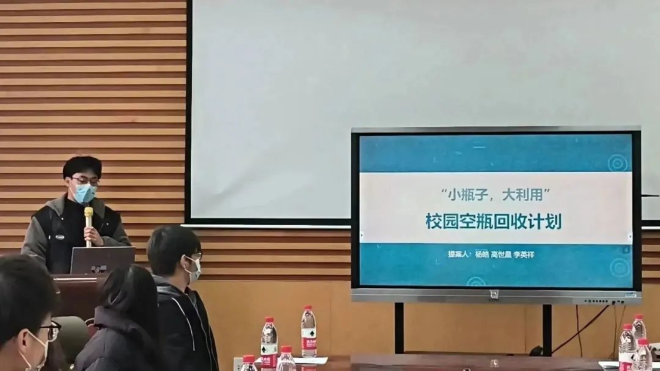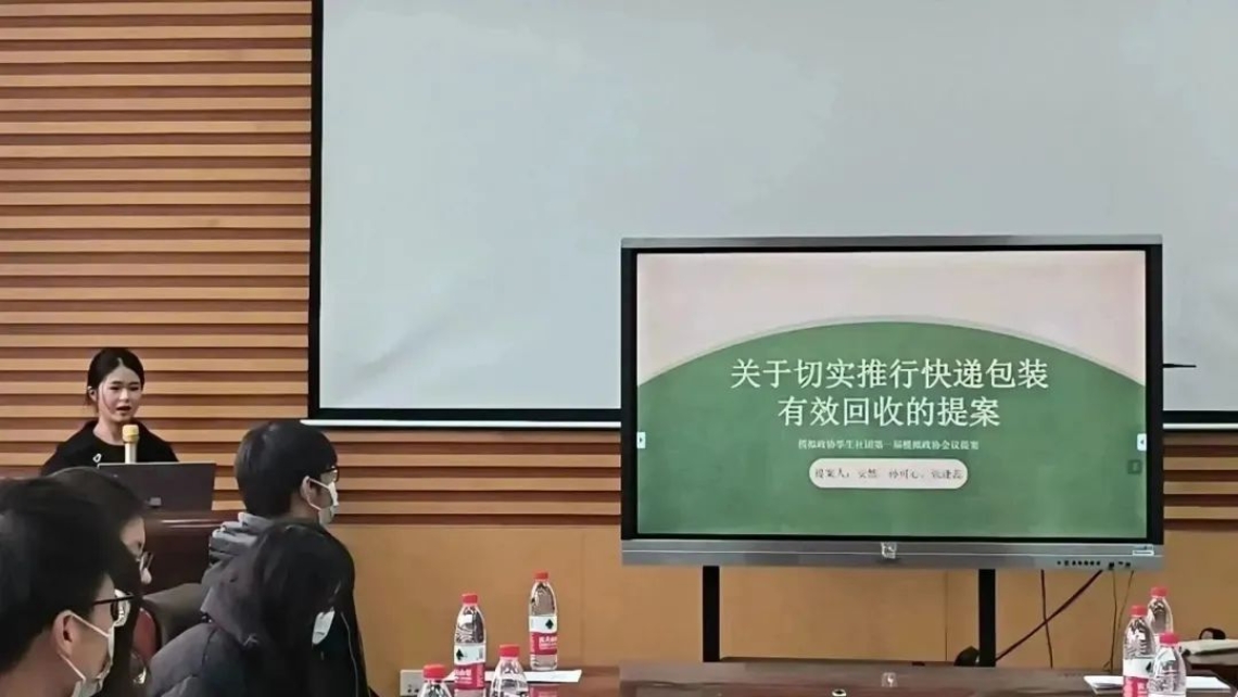 接着,主持人向大家播放了科普短片,短片通过生动的动画向我们展现政协的作用以及提案的相关信息。随后,提案组成员进行了“关于大学生视力保护提案”、“关于推进我校女大学生免费接种HPV疫苗提案”、“关于切实推行快递包装有效回收提案”和“关于校园空瓶回收提案”的集中展示:“关于大学生视力保护提案”从我国大学生近视率近年来不断上升的现状开始,通过展示具体的数据,向我们阐明了问题的重要性;“关于推进我校女大学生免费接种HPV疫苗提案”从对HPV疫苗的介绍开始,介绍了中国HPV疫苗的行业发展状况,由此提出了接种HPV疫苗是现实所趋,民心所向的问题,最后提出了推动适龄女孩HPV疫苗免费接种建议;“关于切实推行快递包装有效回收提案”从快递包装会对环境产生污染的现象出发,认真分析了快递包装产生污染的原因与背景,并在最后提出了具体的奖惩机制、实施方式以及监督机制,这为校园实践该提案提供了明确的指导;“关于校园空瓶回收提案”从社会现象出发,揭露了塑料瓶资源浪费的现状,以及校园内废弃饮料瓶的现象,随后从需求、环保意识和客观设施缺失等方面分析了现象发生原因,接着针对相关原因,提出了具体的建议和解决措施,提出环保积分、智能回收机器等创新类概念。