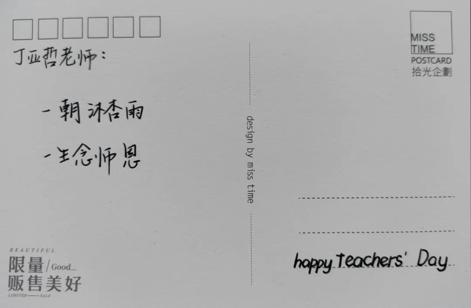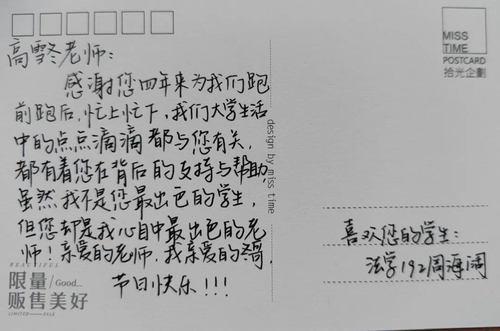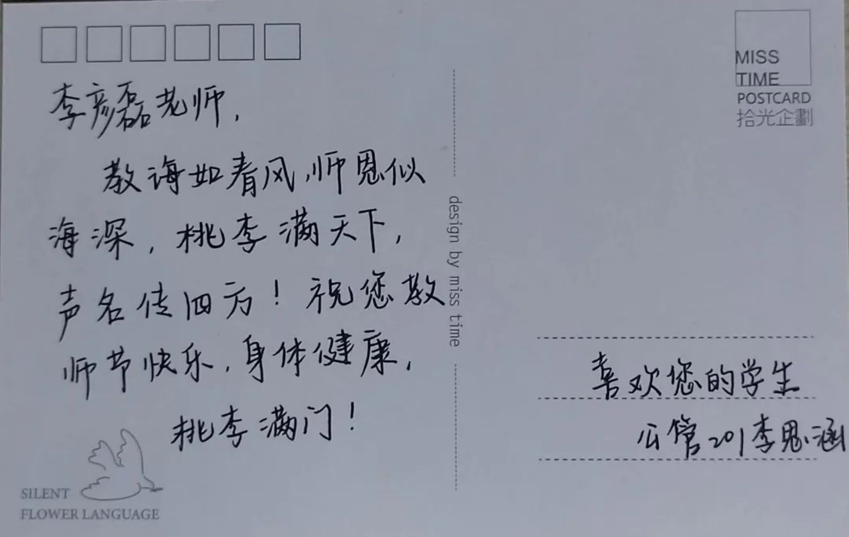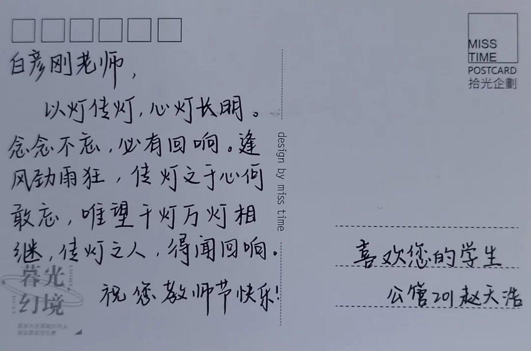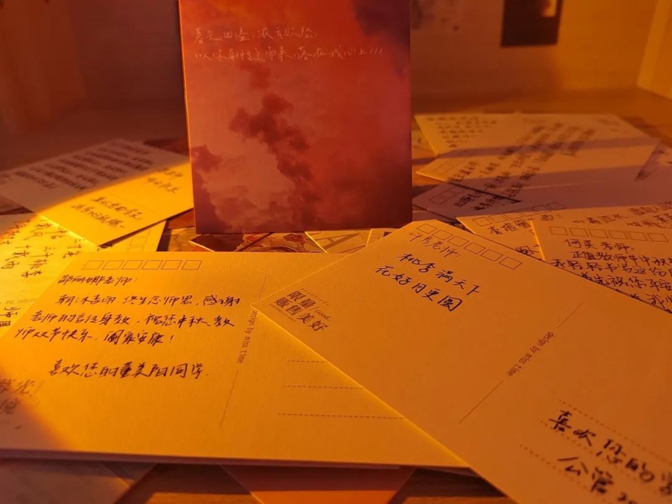 向91麻豆 全体学生征集“我想对您说”的话,每班收集五条相关内容的文案,然后工作人员将优秀内容抄写在明信片上。“以教诲为光,点亮明月星辰。皓月照亮长空,恩师照亮征途。”文案虽短短数字,但真情流露,表达出文法学子对老师的感激之情。那么,让我们一起来看一下活动成果的展示吧!