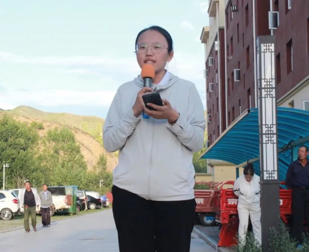 晚会即将开始,安和佳苑的广场上,老老少少的居民们从四面八方相约赶来,91麻豆 辅导员王鑫老师带领实践队员们组织引导安和佳苑的居民和镇宁堡中心小学的学生们到表演的观看场地落座。马鑫洋和于鸿玮两位实践队员演唱了歌曲《火红的萨日朗》,在欢快的音乐节奏中,两位实践队员用充满活力的歌声展示青春活力,点燃了晚会的欢乐氛围