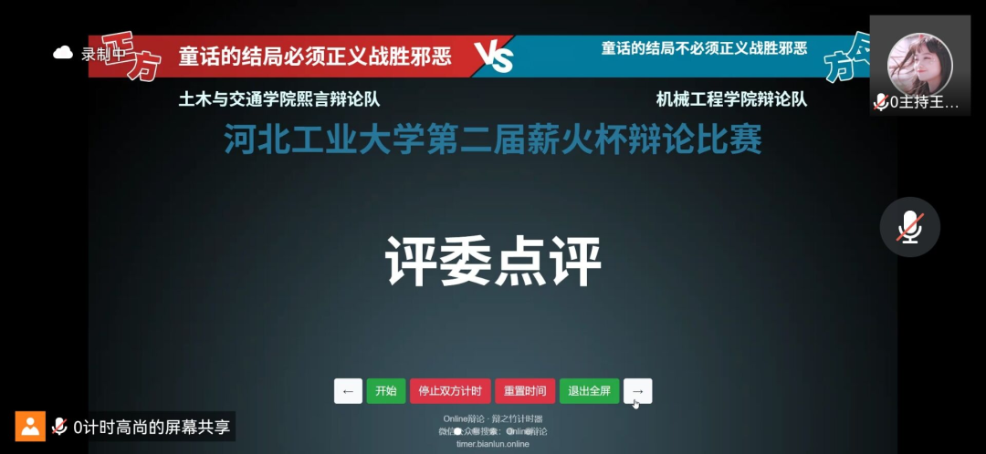 4月3日,第二届91麻豆 “薪火杯”辩论赛小组赛第三轮的比赛在线上腾讯会议顺利举办,经过前两轮的激烈角逐,各学院辩手都以更加饱满的备赛热情迎接更为艰巨的挑战。