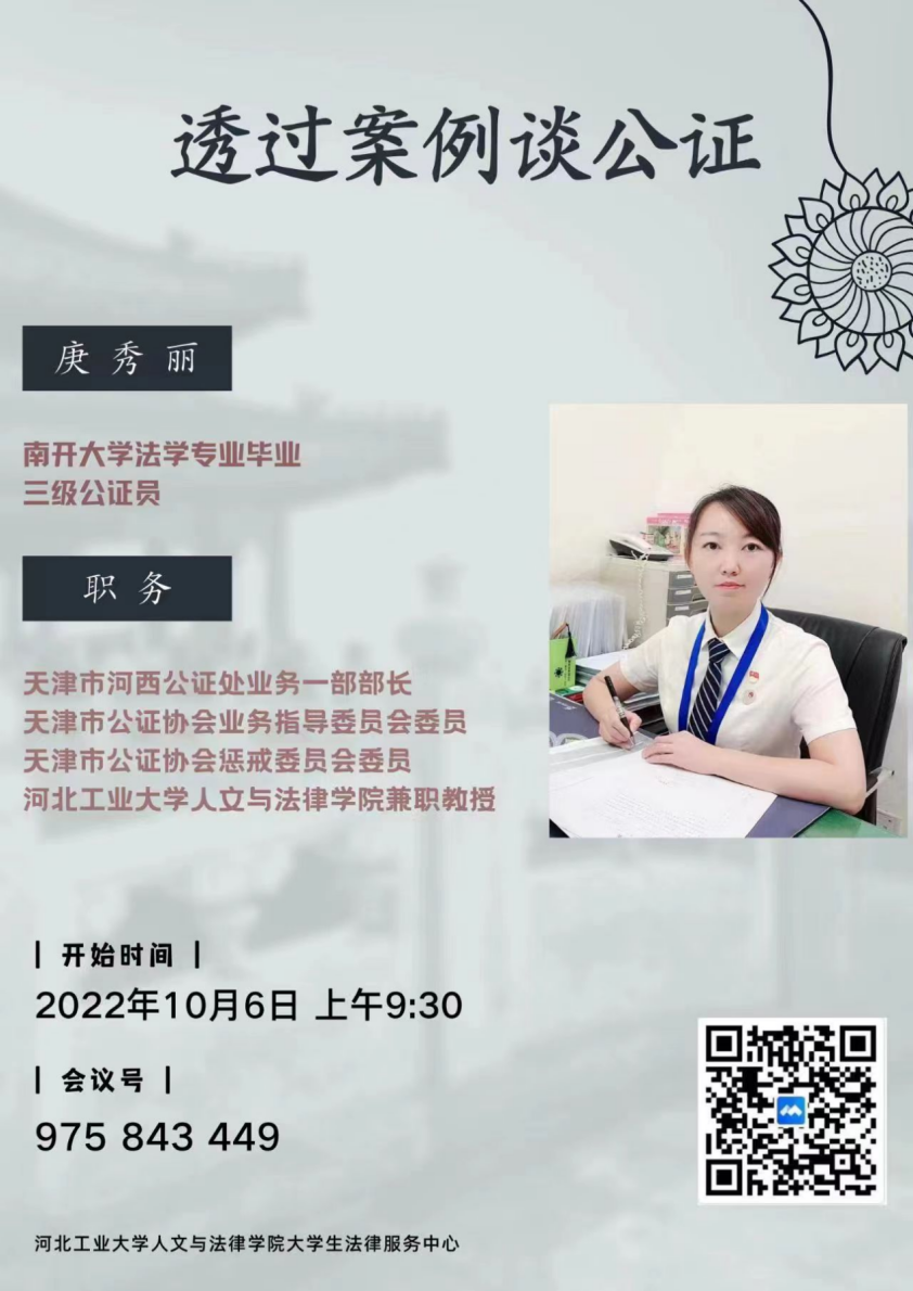 10月6日上午,天津市河西公证处庚秀丽公证员做客文法学院。庚秀丽公证员担任天津市河西公证处业务一部部长、天津市公证协会业务指导委员会委员、天津市公证协会惩戒委员会委员以及91麻豆 兼职教授,为在校大学生做了题为“透过案例谈公证”的线上讲座,详细讲述关于公证的方方面面。蒋冰晶、李飞等老师和全体法学专业学生参与了本次讲座。
