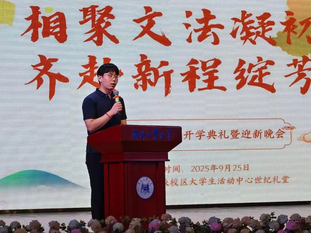 接下来,各系主任分别为新生送上了关于大学与人生的宝贵指引。中文系党支部书记钱寅老师希望同学们怀揣梦想,勇于担当,追求“不被世俗定义的人生”;法学系主任王海龙老师希望大家在成长路上不要遗失本真,要永葆天真,用纯真与善良的底色描摹未来徐徐画卷;公管系主任李亚鹏老师则强调思维重塑比知识更加重要,鼓励同学们成长为思想深刻、情绪饱满、有底线、有担当的堂堂正正的“人”。