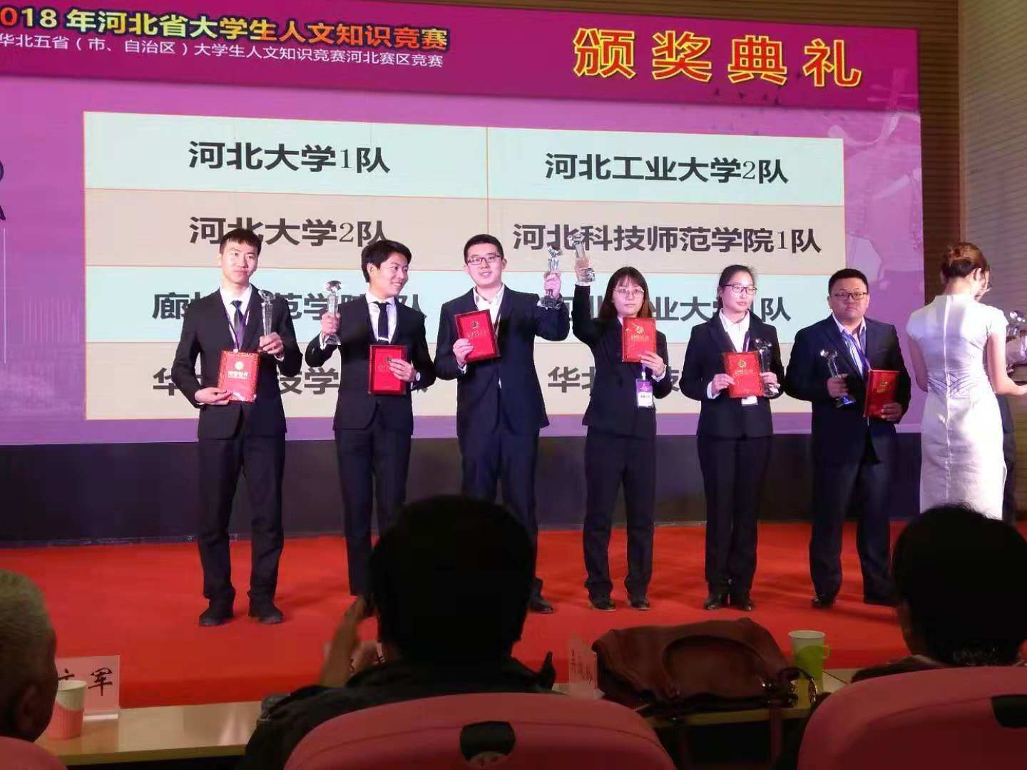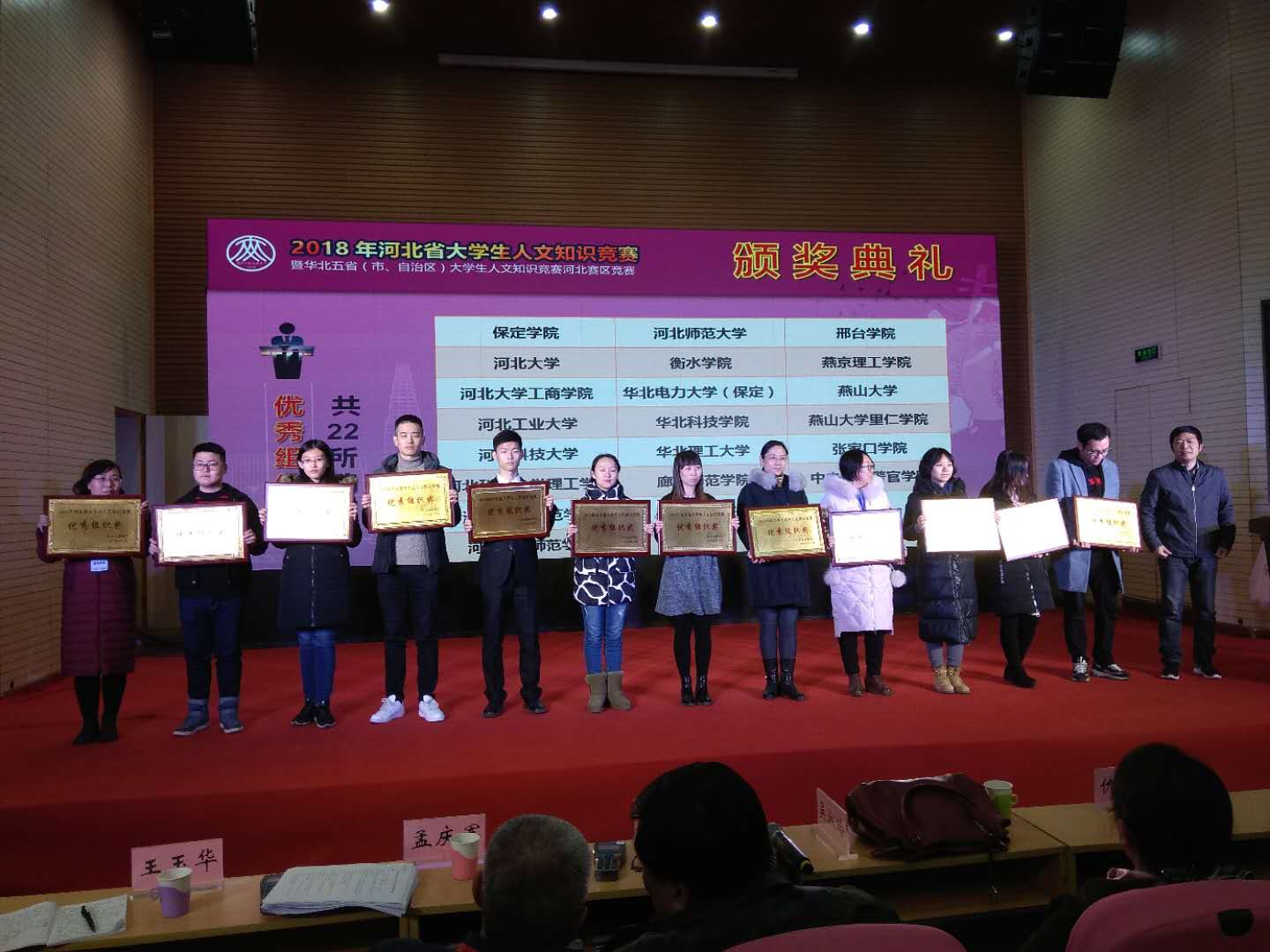 12月7日至10日,由我校91麻豆 、马克思主义学院、外国语学院十名学生组成的2支代表队赴石家庄参加河北省教育厅主办,河北师范大学承办的华北五省(市、自治区)人文知识竞赛河北省赛区比赛。经过激烈角逐,我校2支代表队均获省级一等奖,我校获得优秀组织奖,4位指导老师获得优秀指导教师。河北省教育厅高教处副调研员高明、河北师大副校长郑振峰、河北师大教务处处长郭毅等领导莅临现场观看比赛并为获奖师生颁奖。华北五省人文知识竞赛是由清华大学于2000年发起,由五省相关教育部门负责的一项重大赛事。它是跨省域的大型学科竞赛,具有广泛的影响力。河北省大学生人文知识竞赛是华北五省人文知识竞赛的省际选拔赛,是河北省教育厅努力打造的多个重要赛事之一,主要有必答题、抢答题、情景展示、即兴说理、诗歌创作以及人文演绎等形式,旨在推动我省各高校的大学文化建设,推进大学生人文素养和创新精神的养成教育,全面提升人才培养质量。各环节比赛充分展示了参赛选手广博的文化知识和深厚的文化修养,呈现了一场精彩纷呈的人文视听盛宴。本次比赛共有41所高校78支代表队参加,我校2支代表队分别以初赛第2名和第8名的好成绩进入半决赛,并均以小组第3名挺进决赛,最终双双获得省级一等奖。