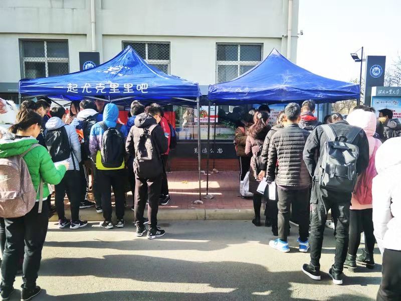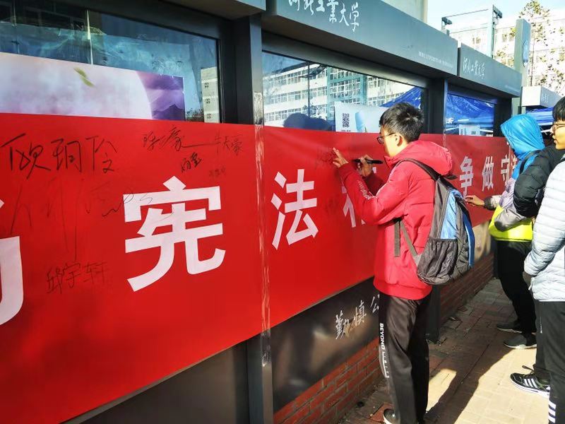 大学生法律中心的成员利用用餐时间在学校西区食堂举行宪法日宣传活动,通过发放宣传单宣传宪法知识,并邀请同学们在宪法日条幅上签字。通过签字活动,同学们增强了对宪法权威和宪法地位的认同。