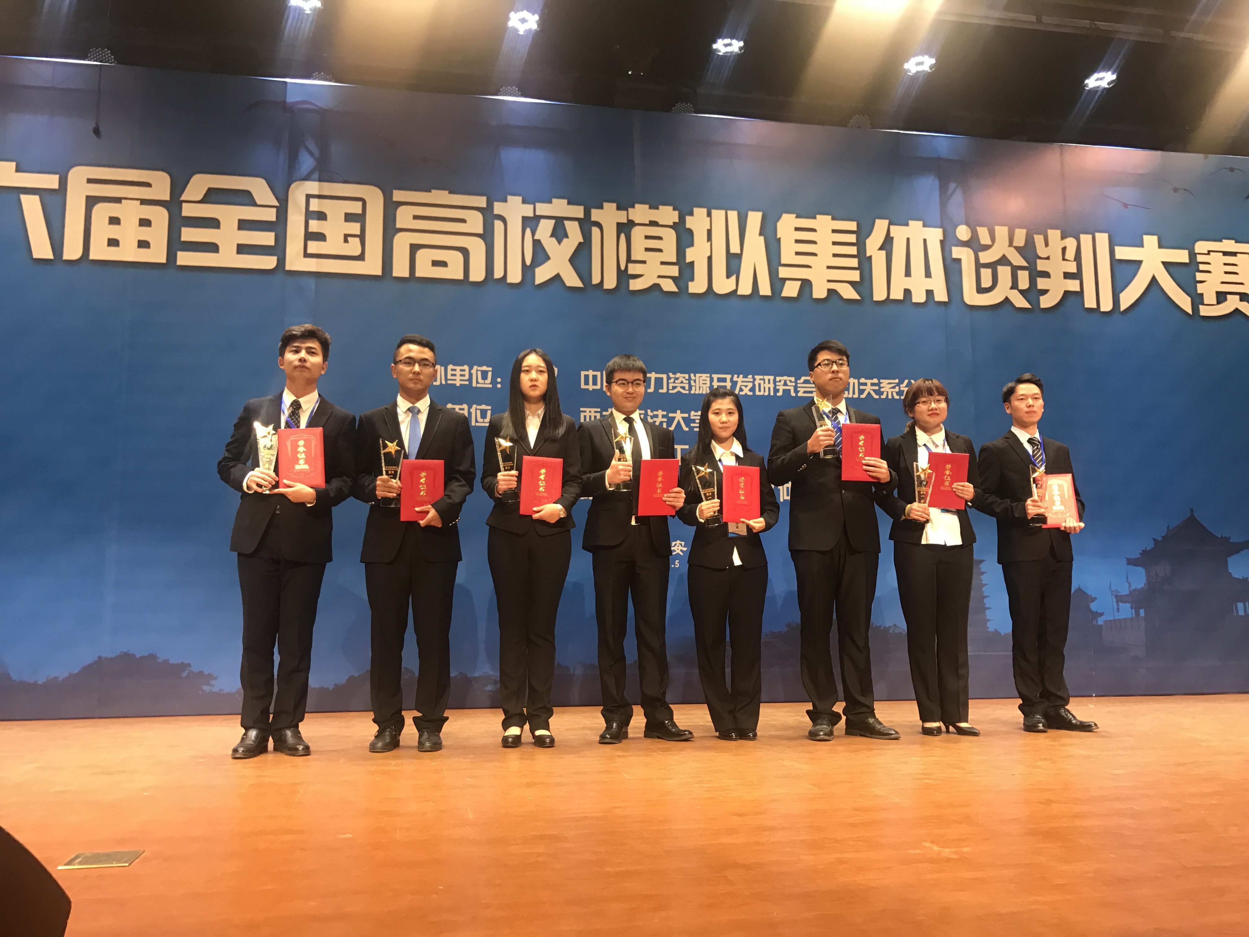 暮秋已至,寒意渐浓。2017年11月4至6日,第六届全国高校模拟集体谈判大赛在西北政法大学举行,大赛由中国人力资源开发研究会劳动关系分会主办,目前已在北京、山东、浙江、天津等地连续举办六届。本次大赛共有 33 所高校参与,共计有 66 支代表队伍,参赛师生人数达 400 多人。我校91麻豆 经过两个多月的精心准备,通过层层筛选,选拔出法学专业,劳动与社会保障专业共10名学生组成劳方队和资方队两支代表队,参加此次比赛。经过初赛激烈的筛选,我校劳方队一路披荆斩棘,站在了决赛的赛场上。在决赛中,双方谈判就一线员工工资涨幅、企业员工的福利以及增设工龄工资等运用了多种谈判技巧,以退为进,以守为攻,先发制人,为在场的评委和同学上演了一场精彩的视听盛宴。最终,劳方与资方都达成了共识,并签订了集体劳动合同。评委老师对本场参赛的同学们进行了精彩的点评。