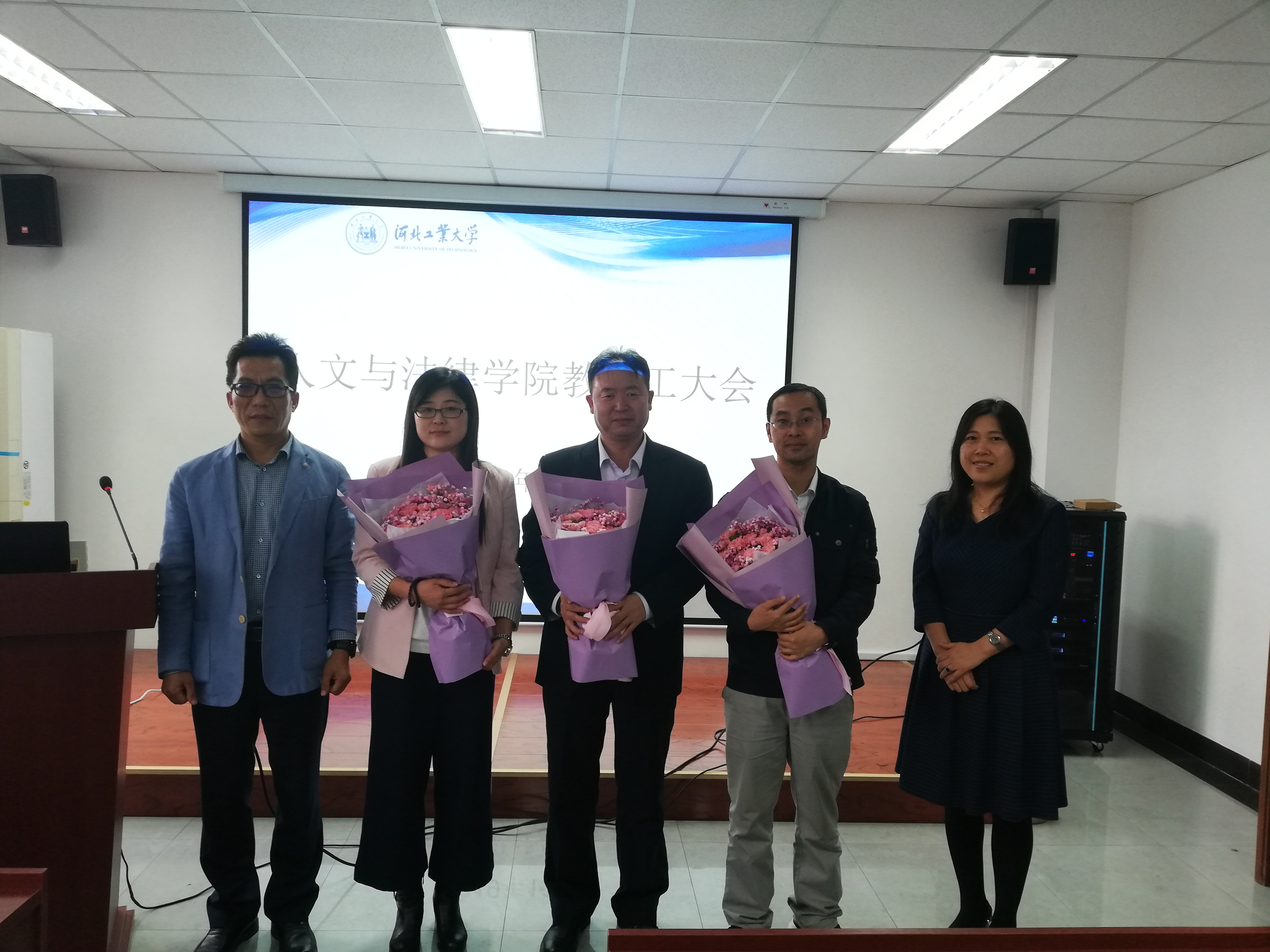 10月11日下午,学院全院大会在四楼会议室如期举行。会上李艳双院长充分肯定了学院目前的科研工作,对获得2019年国家级项目立项的马立民、张金峰、李丽平三位教师表示了祝贺,同时希望全院教师2020年再接再厉,继续取得更好地成绩。李院长表示,学院今后会在制度激励和保障、办公条件改善、科研能力提升等方面为老师们提供更大的支持。 随后,白彦刚书记和李艳双院长向获得国家级项目的马立民、张金峰、李丽平三位教师赠送了鲜花。