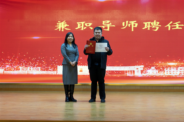 会上举行了学院兼职导师授聘仪式,校友李欢受聘为学院兼职导师,院长李艳双为其颁发聘书。