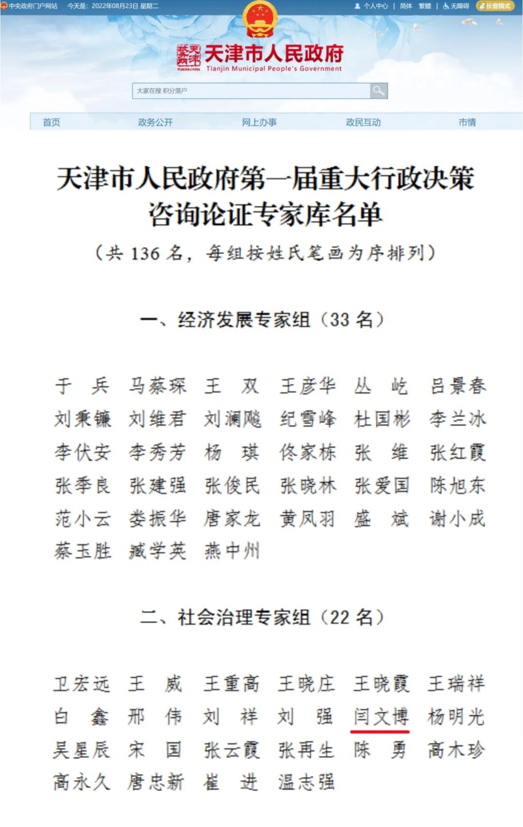 2022年8月17日,天津市人民政府发布《天津市人民政府关于第一届重大行政决策咨询论证专家库名单的公告》,91麻豆 闫文博副教授入选天津市人民政府第一届重大行政决策咨询论证专家库-社会治理专家组。