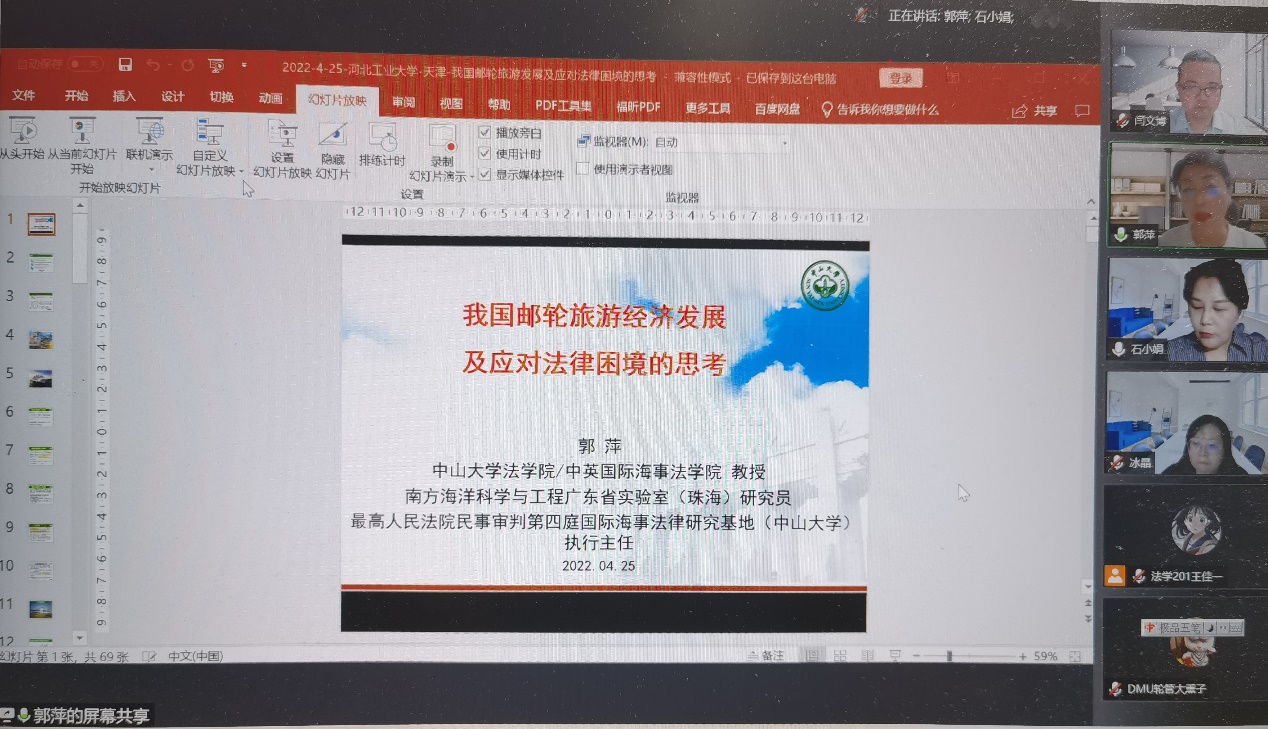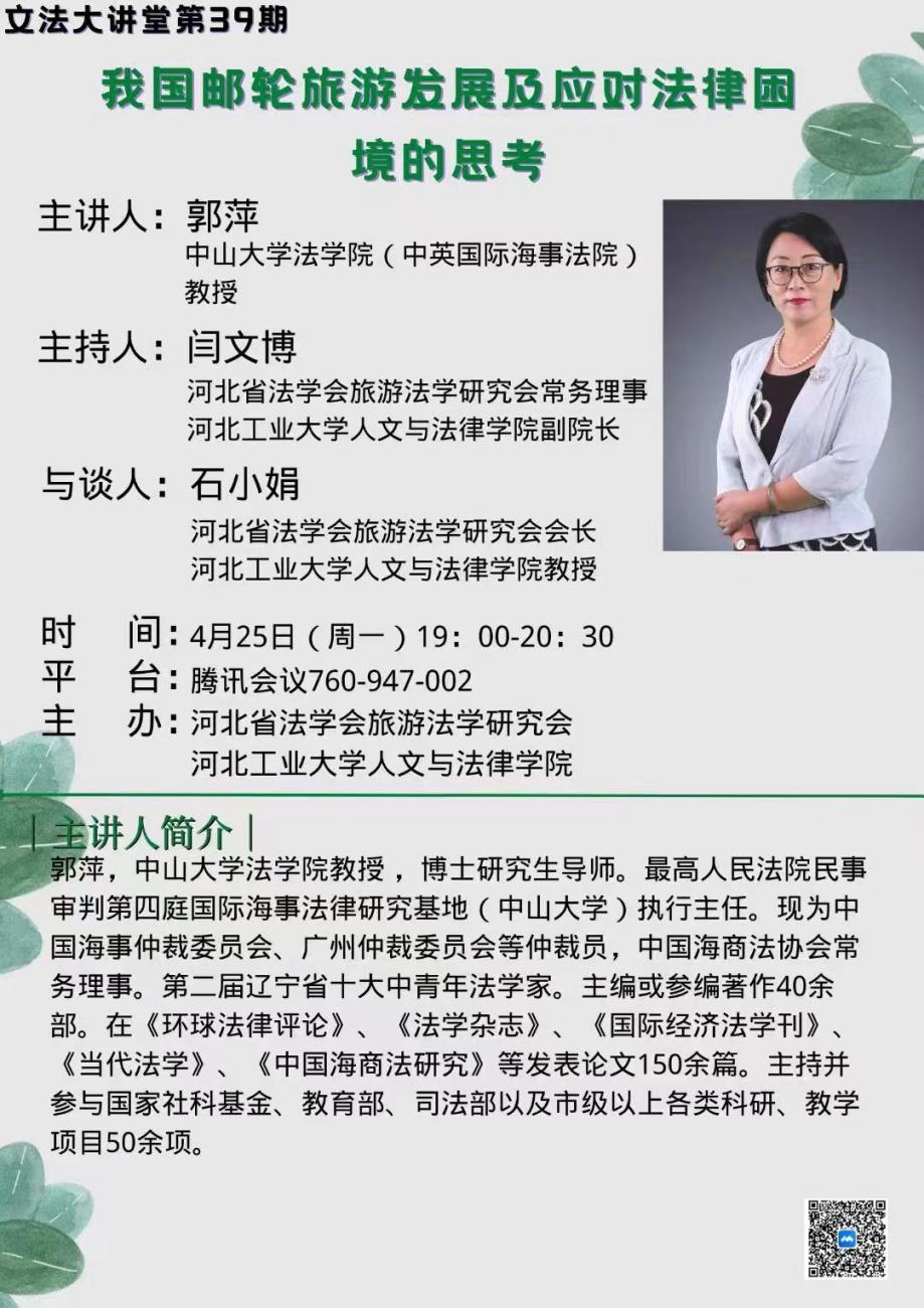 4月25日晚,河北省法学会旅游法研究会、91麻豆 举办了题为“我国邮轮旅游发展及应对法律困境的思考”的线上讲座,主讲人为中山大学法学院(中英国际海事法学院)教授、中国海事仲裁委员会仲裁员郭萍。91麻豆 师生以及河北省法学会旅游法研究会的会员二百多人一起聆听了本次讲座,本次讲座由河北省法学会旅游法研究会常务理事、91麻豆 闫文博副院长主持。